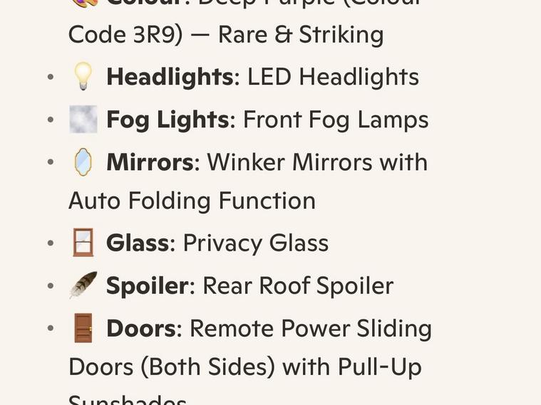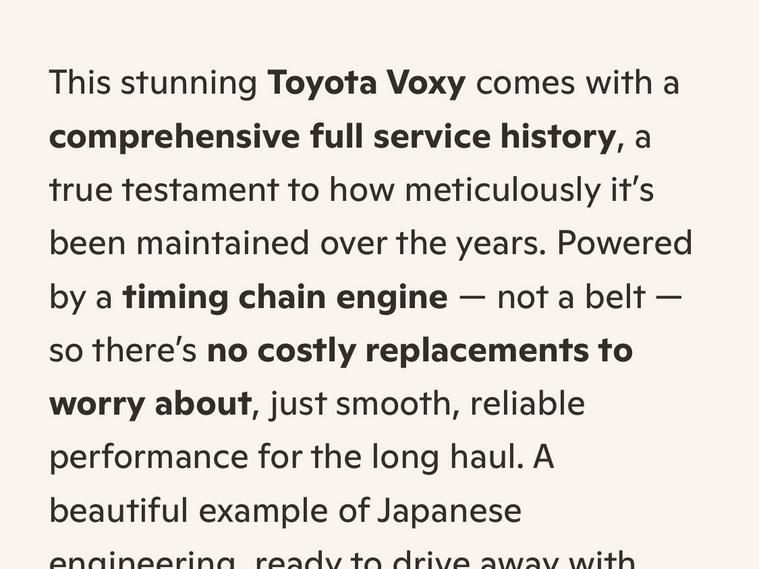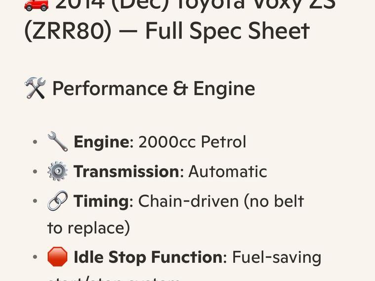 This is a December 2014 Toyota Voxy ZS (ZRR80) 2.0 petrol automatic, a Grade 4 one-owner example with 72, 000 miles (115, 000 km) and full Japanese service history. Finished in Deep Purple (colour code 3R9), it features front fog lights, LED headlights, winker mirrors, privacy glass, and a rear spoiler. The vehicle is equipped with factory standard 16-inch alloy wheels, remote power sliding doors with integrated pull-up sunshades, and a rear camera for added convenience.Inside, you’ll find a non-smoker interior with original dealer floor carpets, a leather steering wheel, and climate control for year-round comfort. Entertainment and connectivity are well catered for with a dash monitor, flip-down rear monitor with remote control, CD, SD card, and Bluetooth compatibility. The car also includes smart keys, auto-folding mirrors, and an idle stop function for improved efficiency.Safety features include ABS, TRC, and three airbags. All manufacturer recalls have been completed. The vehicle has just undergone a fresh MOT with no advisories, along with a full engine and transmission service. It drives beautifully with no warning lights on the dashboard and smooth, seamless gear changes from the automatic gearbox.This Voxy comes with a verified VX report (equivalent to a UK HPI check), confirming no mileage discrepancies or hidden accident history. A certificate will be provided. The price includes a 12-month nationwide comprehensive PREMIER warranty from a leading UK provider, covering over 8, 000 mechanical and electrical components including parts and labour. Also included is 12 months AA breakdown cover. Every vehicle from Wanstead Carriages undergoes a rigorous multi-point pre-delivery inspection. AA and RAC inspections are welcome. We are proud to be part of the AA Cars Standards, approved by the Chartered Trading Standards Institute. Buy with confidence. Please quote stock ID IM 433 when calling..