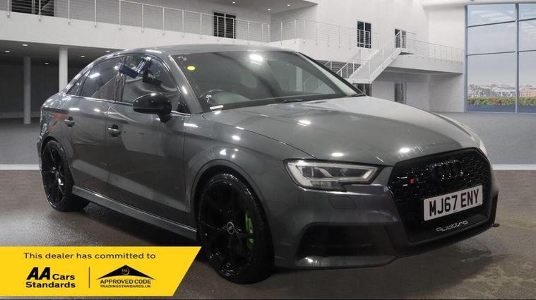 2017 Audi S3 finished in Metallic grey with Low Miles. This car is a well Equipped Great City Car. Includes Interior Features such as; Adjustable Head Restraints, Air Conditioning, Bottle Holders - Front Centre Console and Door, Bottle Holders - Rear Door, Door Courtesy Lights, Driver and Passenger Sun Visor with Ticket Holder, Driver Seat Height Adjustment, Front Door Pockets, Height Adjustable Steering Column, Luggage Compartment Light, Rear Door Pockets, Split Folding Rear Seats - 60-40, Sun Visors with Vanity Mirrors Exterior Features, Allow wheels, Door Handles - Body Coloured, Door Mirrors - Body Coloured, Electric Adjustment and Heated Door Mirrors, Electric Windows - Front and Rear, One Touch Down Drivers Window Control, Rear Spoiler with Integrated Brake Light, Tyre Repair Kit Other Features and Key Information 12V Power Outlet - Front x2, Cruise Control with Speed Limiter, Daytime Running Lights, Power Assisted Steering, RDS Radio-CD Player with MP3 Compatibility, Speakers x2, Trip Computer, Tyre Pressure Monitoring System - TPMS, USB and AUX Connections, ABS - Anti-Lock Brake System, Airbags - Driver, Airbags - Front Passenger, Airbags - Front Side, Airbags - Full Length Curtain, BAS - Brake Assist System, Childproof Rear Door Locks, ESP - Electronic Stability Programme, Front and Rear Seatbelt Reminder, Front Passenger Airbag De-Activation Switch, Immobiliser, ISOFIX Child Seat Anchorage Points - Rear - Outer Rear, Remote Central Locking. *NO HIDDEN ADMIN FEES* 1 YEAR AA BREAKDWON COVER* MINIMUM 3MM TYRE DEPTH, *NO EXTRA CHARGE FOR OUR 3 MONTHS WARRANTY *NO FUEL CHARGES *NO SURCHARGE FOR CREDIT CARDS We supply our vehicles with a Minimum 9 MONTHS MOT Test. If the vehicle requires a service in the next 3 months or 3000 MILES (WHICHEVER COMES SOONEST) we will service the vehicle before delivery. We are fully authorised & Regulated by the Financial Conduct Authority (FCA) and can offer a wide range of finance products and advice. Please visit our website at dealer's website to find out more about us and detailed directions to our site also view our full range of stock. With Over 65 similar cars always available..