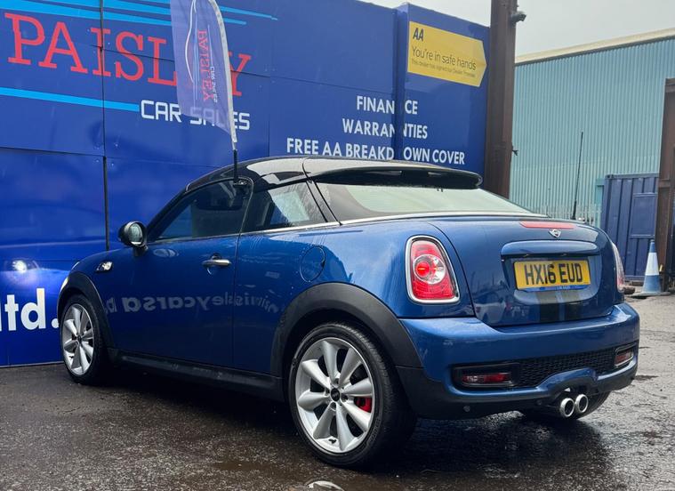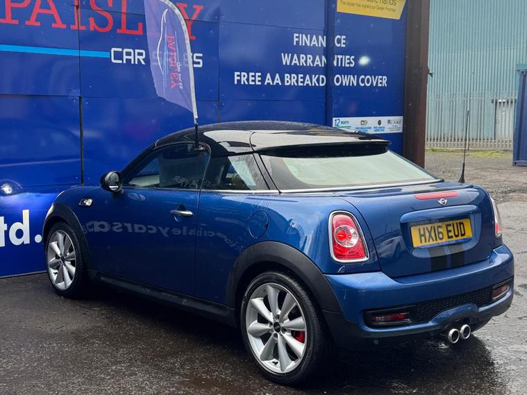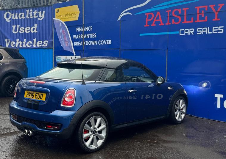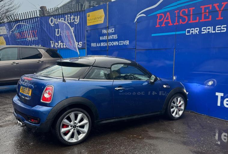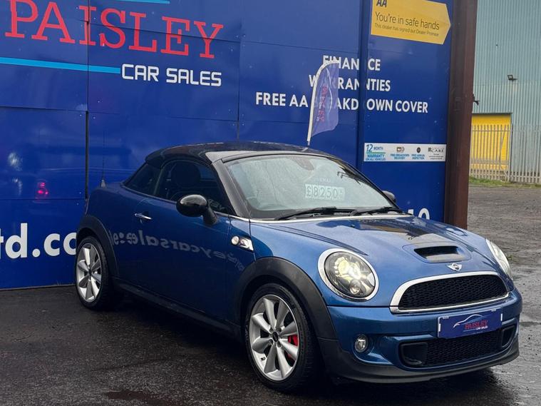 MINI Coupe 1.6 Cooper S Auto Euro 5 2dr, , Full Service History, ULEZ Compliant? Mileage: 66, 840 (Warranted)? Owners: 2 Previous Owners? Service History: Full Service? MOT Valid Until: Full 12 months? Keys: 2 Keys? ULEZ Compliant: Yes (Euro 6)? Warranty: 12Months Included This exceptionally well-maintained Mini Coupe S Auto is in outstanding condition inside and out, boasting a great specification from the factory, including:✅ Automatic Transmission ✅ Electric Windows✅ Auto Lights✅ Central Locking✅ Air Conditioning✅Heated Leather Seats✅ Electronic Power Steering - Speed Related✅ HPI Clear – All Documentation PresentQuality Assurance & Extra Benefits:Finance Available – Competitive finance options to suit your budget.Part Exchange Welcome – Get a fair valuation for your current vehicle.AA Approved Dealership – Buy with confidence.Drive Away Same Day – 5-Day Insurance Available Courtesy of the AA.Free Home Delivery – Up to 25 miles for online orders.Flexible Payment Options – We accept all major debit cards.About Paisley Car Sales :We are a trusted, Renfrewshire-Based used car dealership, dedicated to providing high-quality vehicles and outstanding customer service. If this vehicle doesn’t meet your needs, we can source one to your specifications.? Visit Us: Office 2, Wellington street, Paisley, Renfrewshire, PA3 2JQ? Call Us: 01410022098? Website: dealer's website this exclusive web-discounted price while it lasts! Contact us today for more details or to book a test drive. ?Here at Paisley Car Sales we are always ready to go the extra mile. Don't hesitate to contact us!Vehicle registered: 07/03/2016Buying with Paisley Car Sales Ltd:Welcome to Paisley Car Sales, are a small family run used dealership. We hope you enjoy your experience with us, we encourage you to browse our current stock of cars and if there is nothing that jumps out to you, we are more than happy to source a vehicle on your request. Feel free to get in touch.