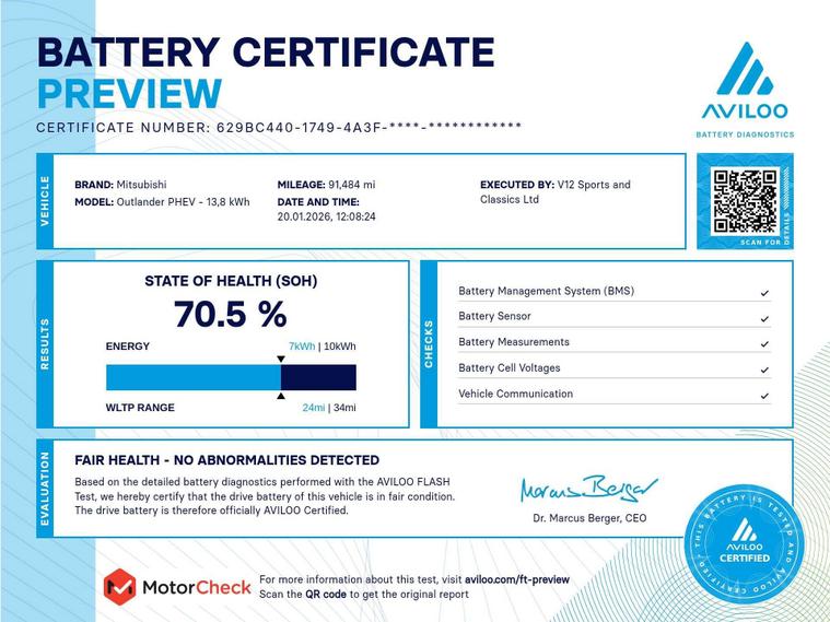 Introducing the Mitsubishi Outlander - the ultimate SUV that combines power, efficiency, and style in one sleek package. With its 2.4h TwinMotor 13.8kWh Juro Petrol Plug-in Hybrid engine, this vehicle is not only environmentally friendly but also delivers an impressive 209 ps of power. Finished in a stunning White exterior, the Mitsubishi Outlander is sure to turn heads wherever you go. Whether you're cruising through the city streets or tackling off-road adventures, this SUV is designed to handle it all with ease. Equipped with a CVT 4WD Euro 6 (s/s) system, the Mitsubishi Outlander offers a smooth and responsive driving experience, no matter the road conditions. Plus, with its spacious interior and advanced features, you and your passengers can enjoy every journey in comfort and style. Don't miss out on the opportunity to own the Mitsubishi Outlander - the perfect blend of performance, efficiency, and luxury. Visit our showroom today and experience the thrill of driving this exceptional SUV for yourself.For peace of mind this vehicle has completed a multi point AA inspection. Vehicle specification can be found below. From time to time vehicles have manufacturer recalls notified. Please read our recall policy on our website for further information. This vehicle comes with an AVILOO Battery Health Certificate - the global standard for EV battery testing. Full independent analysis confirms excellent battery condition with detailed State of Health assessment, cell-level checks, and accurate range data. Certificate included with purchase for your complete peace of mind and future resale value..