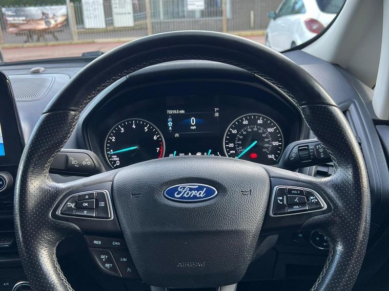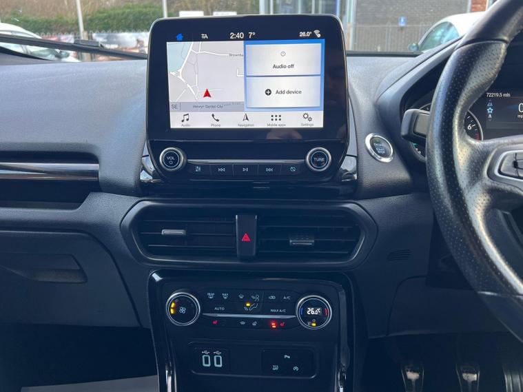 ***READY TO DRIVE AWAY***This 2018 Ford EcoSport T ST-Line is a superb example, boasting a full service history and having had only one owner from new. This Euro 6 compliant 1.0L petrol model comes with an MOT valid until October 2026 and a clear vehicle history check, ensuring your peace of mind. Inside, you'll find the Ford DAB Navigation System with Ford SYNC3, offering seamless integration with Android Auto and Apple CarPlay, alongside Bluetooth connectivity. Comfort is assured with Electronic Automatic Temperature Control, while the rear view camera and rear parking sensors provide excellent assistance when parking. Practicality is key with the 60-40 split rear seat and a centre console featuring a sliding armrest.This EcoSport ST-Line offers impressive fuel economy, achieving a notable 53 miles per gallon, and benefits from low CO2 emissions, making it an economical choice. These highlights demonstrate how this vehicle stands out from others in its class, offering a compelling blend of technology, comfort, and efficiency. A 3 month warranty is also included, further enhancing the value of this well maintained Ford EcoSport..