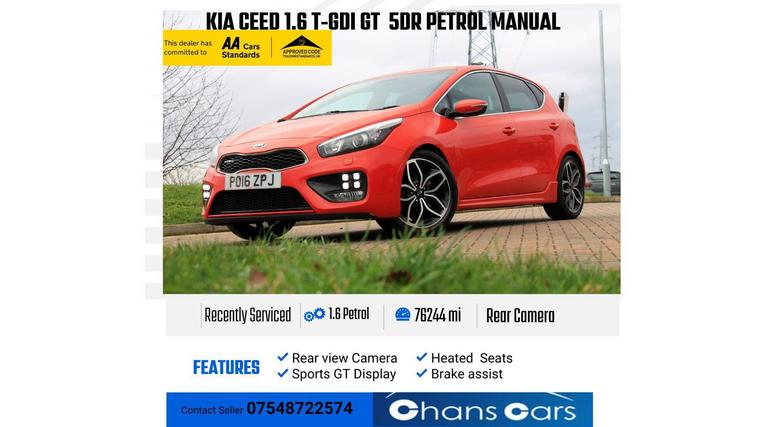 This 2016 Kia Ceed T GDi GT is a well maintained example of this popular model. It features a responsive 1.6 litre petrol engine and meets Euro 6 emission standards. Inside, you'll find comfortable heated front seats, a smart key entry system for effortless access, and dual automatic air conditioning with an ioniser to keep the cabin pleasant. For convenience and safety, it also includes xenon headlights with auto levelling and a reversing camera system to assist with parking. Service history , 76244 Miles, MOT Until -28/01/2027. Phone Bluetooth, Cruise Control, Power Steering, Isofix, Radio with CD and MP3, Rear Parking Sensors And camera, Heated Seats and Heated SteeringThe Kia Ceed GT offers an engaging driving experience, highlighted by its brisk acceleration from 0 to 60 miles per hour in just 7.3 seconds. This performance, combined with its generous boot space, makes it a practical choice for everyday use and longer journeys. These attributes, along with its comprehensive feature set, position this Ceed GT as a compelling option when compared to other vehicles in its class..