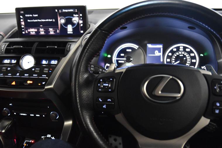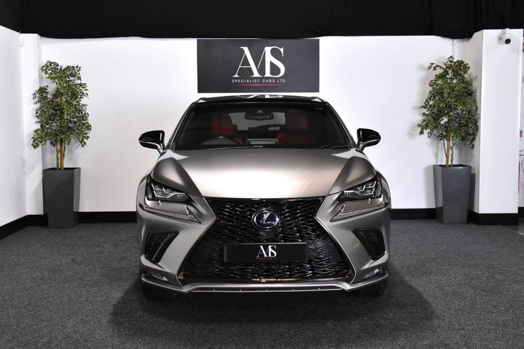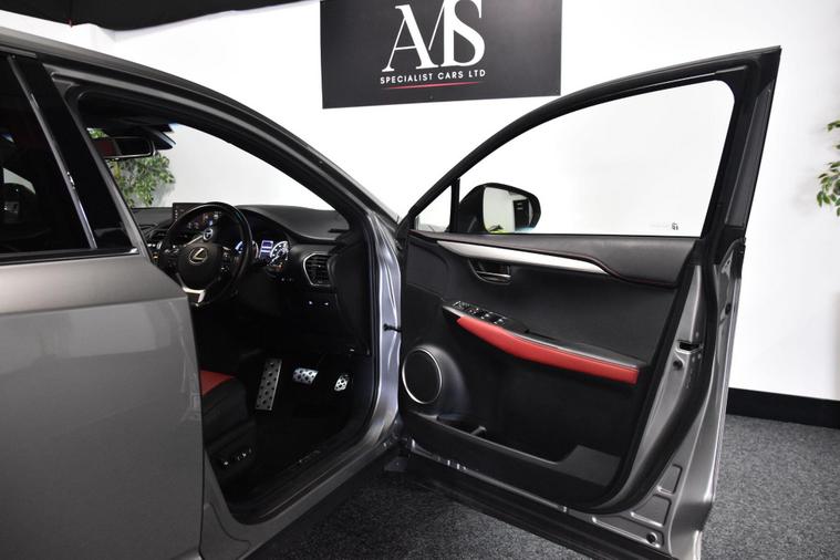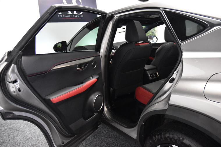 We are pleased to offer this stunning Lexus NX300H F-Sport finished in metallic Sonic silver with contrasting two tone black and flare red leather interior. This car has covered just 48, 000 miles from new complete with fantastic service history. The spec of this car includes panoramic roof, 18 inch diamond cut wheels, fully electric front seats, heated front seats, electric steering column, reverse camera, blue tooth phone connection, navigation, privacy glass, power tailgate, keyless start, LED headlights, auto lights and wipers, power folding mirrors and much more..
