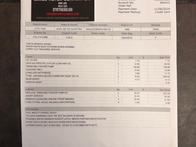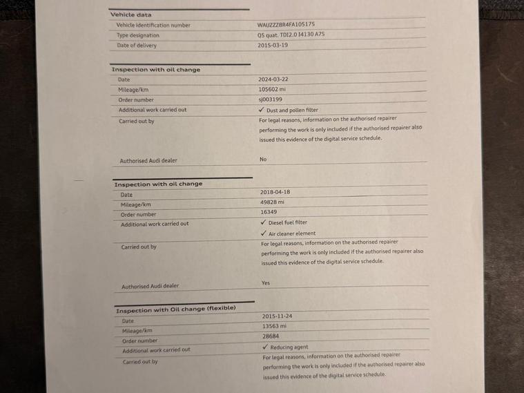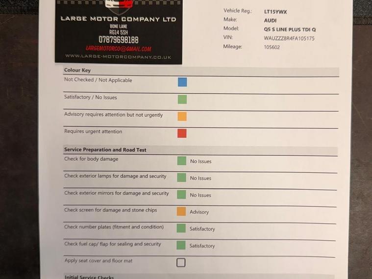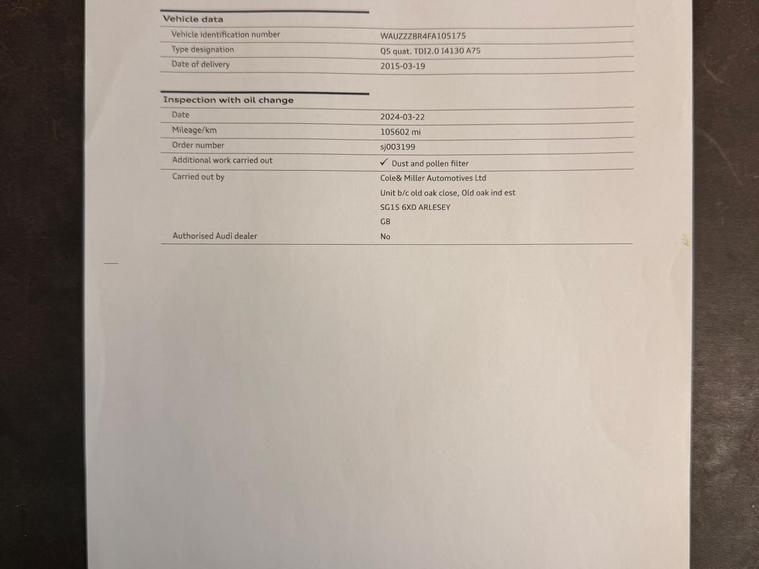 Boasting a full service history and having had only two owners, this 2015 Audi Q5 TDI S line Plus represents excellent provenance. This four wheel drive model is equipped with a 2.0 litre diesel engine and features striking 20 inch alloy wheels with a titanium optic finish. For your convenience, it includes mobile telephone preparation with Bluetooth and voice control, alongside the advanced Technology Package. The door mirrors are both heated and electrically adjustable, folding for ease of use, and the front seats are also heated for added comfort.This Audi Q5 offers a generous boot space, making it a practical choice for families or those needing ample storage. The inclusion of a 12 month MOT on purchase and a 3 month warranty provides further peace of mind. The comprehensive service history, with the last service at 121459 miles, indicates that this vehicle has been well maintained, setting it apart from other similar models on the market..