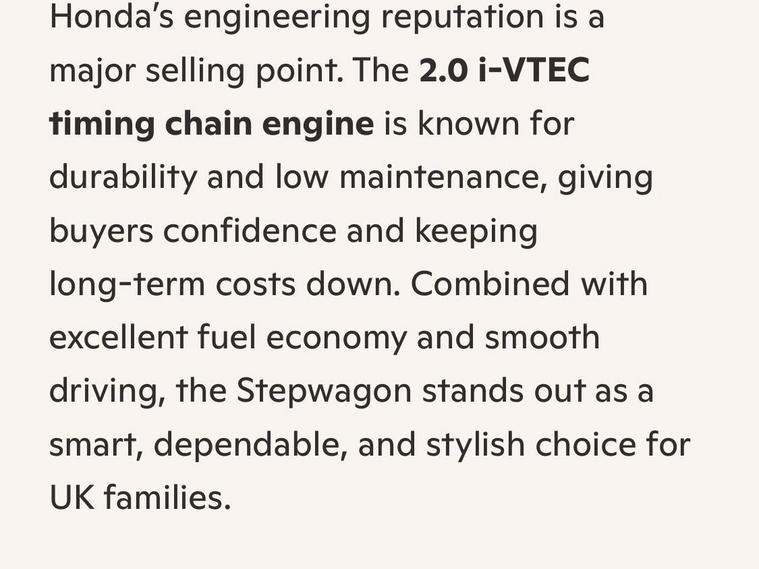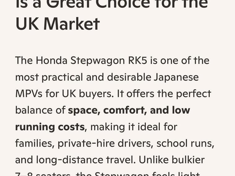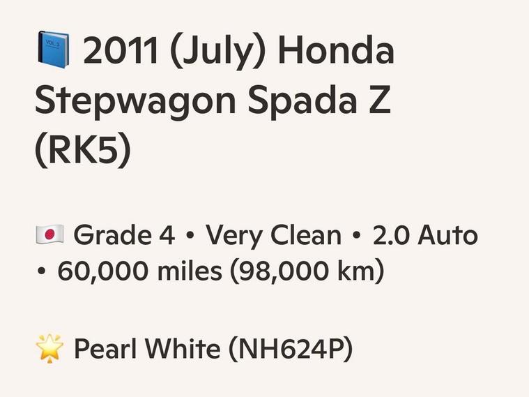 2011 (July) Honda Stepwagon RK5 Spada Z – Grade 4 – Fresh Japanese Import – ImmaculateThis beautifully kept Honda Stepwagon Spada Z has just arrived from Japan, graded a solid Grade 4, and it shows. From the moment you open the door, you can tell this was a cherished vehicle — the driver’s seat condition alone speaks volumes about the care it received from its previous owner. Finished in Pearl White NH624P, it looks every bit as clean and elegant as it drives.Powered by a smooth 2000cc automatic engine with paddle shift, the Stepwagon delivers effortless performance. The gearbox is seamless, the drive is tight, and after an extended road test, no warning lights are present. Recently MOT’d, with a fresh engine service and transmission service, it’s fully prepared for its next family.Inside and out, the spec is impressive: HID headlights, front fog lights with optional chrome garnish, winker mirrors, privacy glass, rear spoiler, remote power sliding doors, rear camera, climate control, traction control, ABS, leather steering wheel, CD/Bluetooth, front airbags, smart keys x2, and dealer-original floor carpets. Factory alloy wheels sit on excellent radial tyres. All manufacturer recalls have been completed.Mileage stands at 60, 000 miles (98, 000 km) — fully verified with a VX Report, Japan’s equivalent to the UK HPI, confirming no mileage issues or hidden accidents. A printed certificate is provided.Your purchase includes 12 months Nationwide Premier Warranty, covering over 8, 000 mechanical and electrical components, plus 12 months AA Breakdown Cover. As an AA Cars Standards approved dealer, you can buy with complete confidence. Every vehicle undergoes a rigorous multi‑point inspection, and AA/RAC inspections are always welcome.A truly immaculate, freshly imported Stepwagon — ready for its next proud owner.Please mention Stock ID: IM421 when calling..