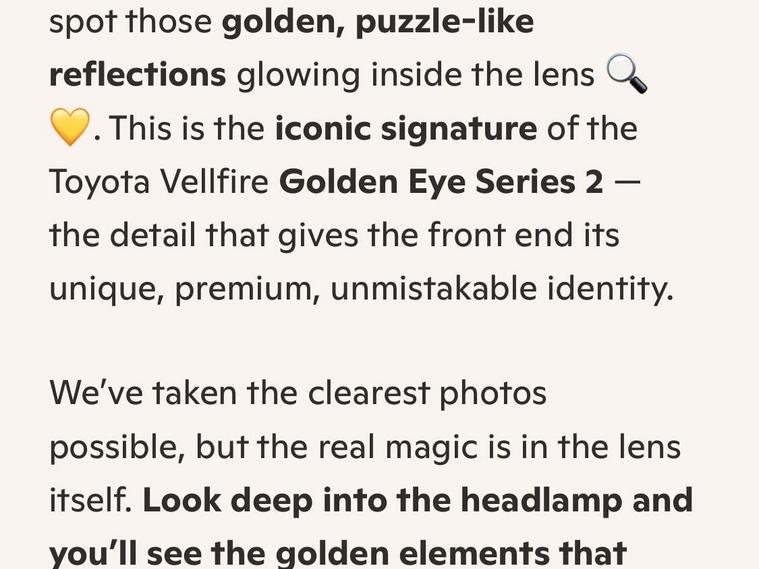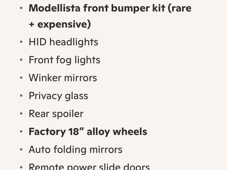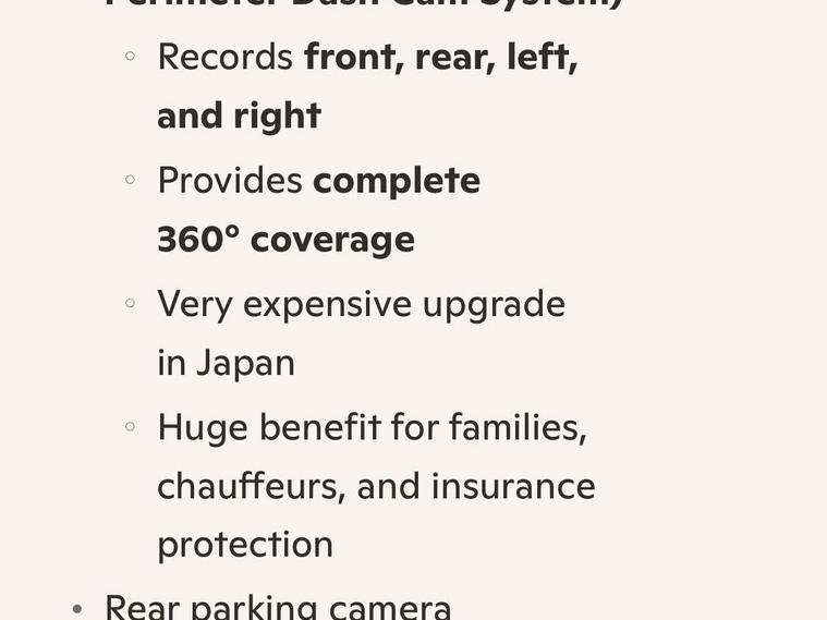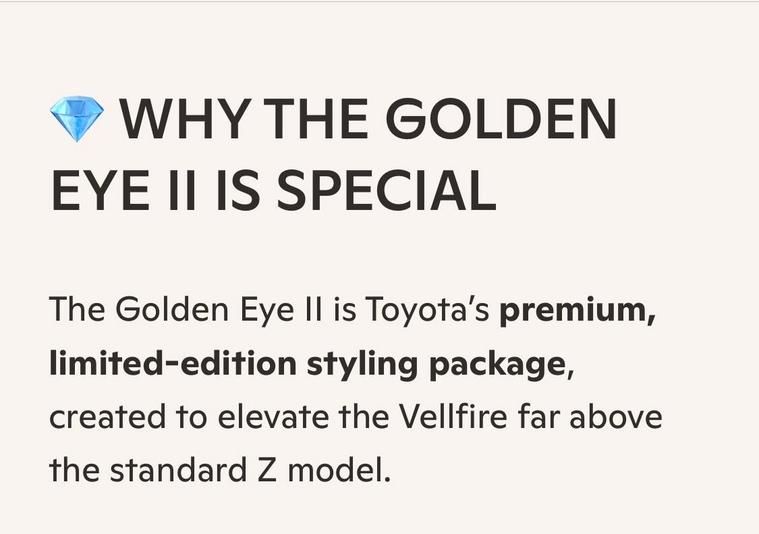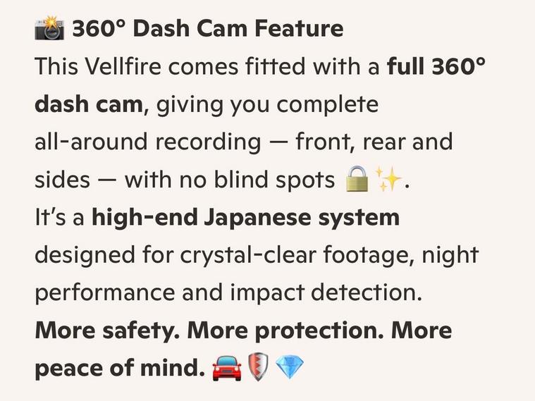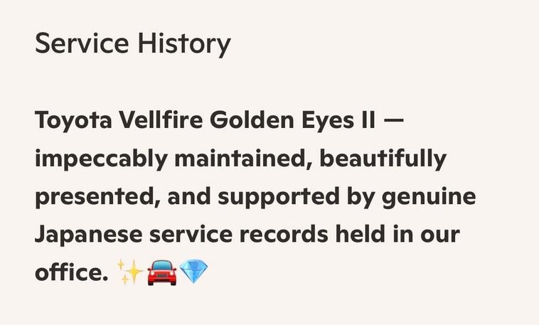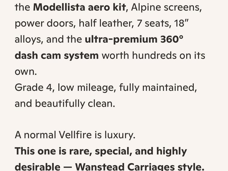 2014 (Sep) Toyota Vellfire 2.4Z Golden Eye II – Pearl White (070) - Japanese Service History PresentA very clean Grade 4 example finished in the desirable Pearl White with the rare Golden Eye II styling and the sought‑after Modellista front bumper kit. This is a high‑spec, low‑mileage vehicle presented in excellent condition throughout.This Vellfire comes with HID headlights, front fog lights, winker mirrors, privacy glass, rear spoiler, factory 18” alloy wheels, remote power slide doors, and a remote power tailgate. The exterior presents extremely well and carries the premium Golden Eye II look that stands out from a standard Vellfire.Inside, it offers half leather seats, Alpine head unit, Alpine flip‑down rear monitor with remote, CD/SD/Bluetooth functions, dual climate control with Nanoe, dealer original floor carpets, cruise control, smart keys (x2), auto folding mirrors and auto wipers. A rear camera and all‑round parking sensors provide excellent visibility and convenience.This example is also fitted with a 360‑degree drive recorder, offering full perimeter recording and enhanced safety. Front, side and curtain airbags, TRC and ABS complete the safety package. All manufacturer recalls have been completed, and the vehicle has covered just 60, 000 miles (97, 000 km).Recently MOT’d with no advisories, and both an engine service and transmission service have been completed. The vehicle drives beautifully with no warning lights and a smooth, seamless automatic dealer's website with a verified VX report confirming no mileage discrepancies or hidden accidents. Includes 12 months Nationwide Comprehensive Premier Warranty covering over 8, 000 mechanical and electrical components, plus 12 months AA Breakdown Cover. All vehicles are HPI checked and undergo a rigorous multi‑point inspection. AA/RAC inspections welcome.Please mention Stock ID: IM 451 when calling..