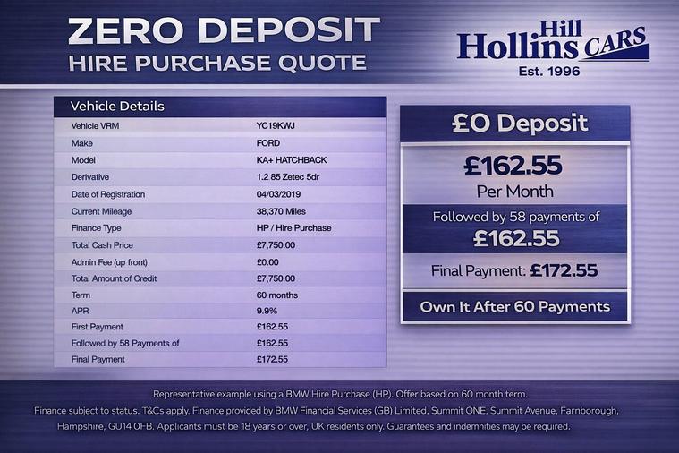 ? Registered: 04/03/2019? Reg Number: YC19 KWJ? Ford Ka+ 1.2 Ti-VCT Zetec? Engine: 1.2 litre petrol (Euro 6)⚙️ Gearbox: 5-speed manual?️ Mileage: 38, 370 miles? Ford Main Dealer Service History:This Ka+ benefits from a documented Ford main dealer service history, providing strong reassurance for its age and mileage:• 13/02/2025 at 36, 949 miles• 27/04/2023 at 27, 703 miles• 01/06/2021 at 19, 994 miles• 12/02/2020 at 11, 849 milesA well-maintained example with sensible servicing throughout its life.? Supplied With Complete Peace of Mind:✔️ 12 Months MOT on purchase✔️ 56-Point Pre-Delivery Inspection✔️ Comprehensive Warranty Included✔️ 12 Months Free AA Breakdown Cover? Specification & Key Features:The Zetec trim offers a great level of everyday equipment:✅ Ford SYNC 3 with 6.5in Touchscreen✅ Apple CarPlay & Android Auto✅ Cruise Control✅ DAB Digital Radio✅ Bluetooth Hands-Free & Media Streaming✅ Manual Air Conditioning✅ USB ConnectivitySimple, modern tech that buyers actively look for.? Why This Ka+ Makes Sense:• Low insurance group• Low CO₂ emissions• Economical petrol engine• Easy to drive and cheap to runAn ideal choice for a first car, commuter, or anyone wanting sensible, reliable motoring.? Condition:Presented in good condition both inside and out, this Ka+ drives exactly as it should — smooth, responsive, and comfortable for everyday use.? Finance Available:Competitive HP & PCP finance options available, with no deposit required (subject to status). Please ask for a personalised quote.? Enquiries Welcome:Open 7 days a week — viewings and test drives always welcome..