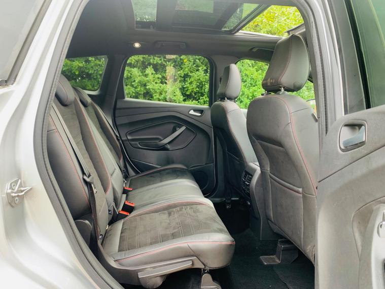 01 FORMER KEEPER, 06 SERVICES BY FORD, MOT 10/10/2026, SPARE KEY, This 2018 Ford Kuga TDCi ST-Line X boasts a clear vehicle history, offering you peace of mind. This Four Wheel Drive model is powered by a 2.0 litre diesel engine and meets Euro 6 emission standards. It comes equipped with automatic halogen headlights featuring LED daytime running lights, keyless entry with a hands free power tailgate, and enhanced active park assist with front and rear sensors. Inside, you'll find DEATC dual zone electronic automatic temperature control for your comfort and a power opening panoramic roof. The ST-Line X trim level signifies a higher specification, indicating this Kuga offers more than many similar vehicles. Its low CO2 emissions are a notable highlight, contributing to more economical running costs. The combination of its advanced features, robust engine, and four wheel drive capability makes this Ford Kuga a well rounded and capable choice..