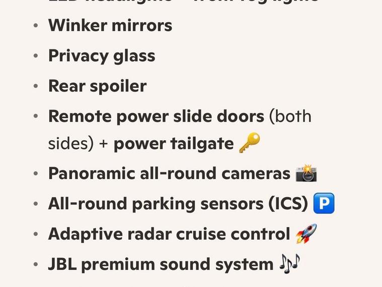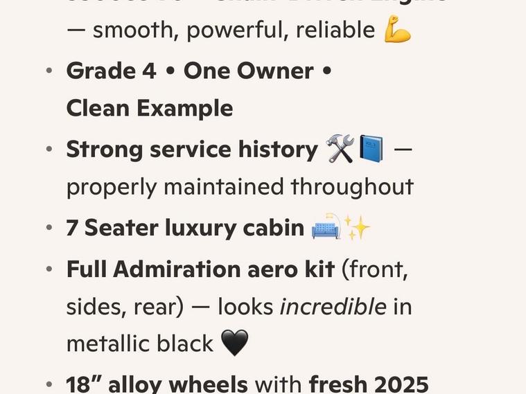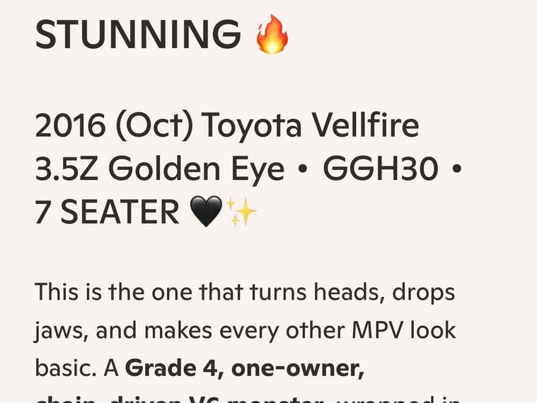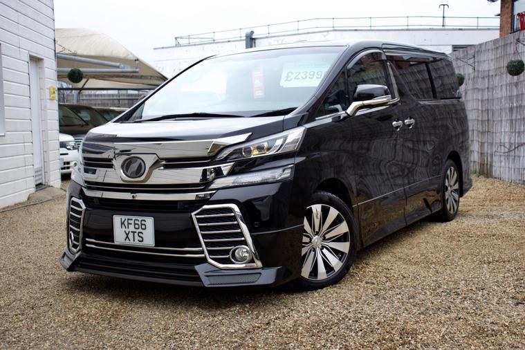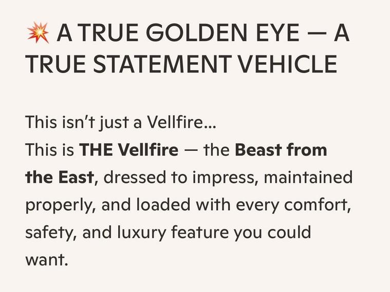 2016 (Oct) Toyota Vellfire 3.5Z Golden Eye (GGH30) • Metallic Black (222)-Stock ID: IM434A stunning Grade 4, one‑owner example presented in exceptional condition with only 49, 000 miles and a solid service history. Powered by the smooth and reliable 3500cc chain‑driven V6 engine and finished with the full Admiration aero kit all round, this Golden Eye stands out with its bold styling and premium road presence.This vehicle is equipped with LED headlights, front fog lights, winker mirrors, privacy glass, rear spoiler, twin sunroofs, 18” alloy wheels fitted with 2025 radial tyres, remote power slide doors and remote rear gate. It features panoramic all‑round cameras, all‑round parking sensors (ICS), adaptive speed radar cruise control, and front, side and curtain airbags supported by ABS, PCS and traction control.Inside, it offers half leather seating, dealer option curtains, dual climate control with Nanoe, dealer option hot/cold box, JBL premium sound system with dash monitor and flip‑down rear monitor, and full media compatibility including CD, SD, Bluetooth, USB and HDMI. Additional features include front and rear drive recorders, heated wipers, remote engine starter, smart keys (x2), dealer original floor carpets, full spare tyre and chrome trim on steps and dashboard. All manufacturer recalls have been completed.The vehicle has just received a fresh MOT with no advisories, along with a recent engine service and transmission service. It comes with a verified VX report (equivalent to UK HPI), confirming no mileage discrepancies or hidden accidents. The car drives beautifully with no warning lights, and the automatic gearbox delivers seamless gear changes.Included in the price is a 12‑month Nationwide Premier Warranty, covering over 8000 mechanical and electrical components with parts and labour. All vehicles are HPI checked, undergo a rigorous multi‑point inspection, and come with 12 months AA Breakdown Cover. Wanstead Carriages is proud to operate under the AA Cars Standards, approved by the Chartered Trading Standards.