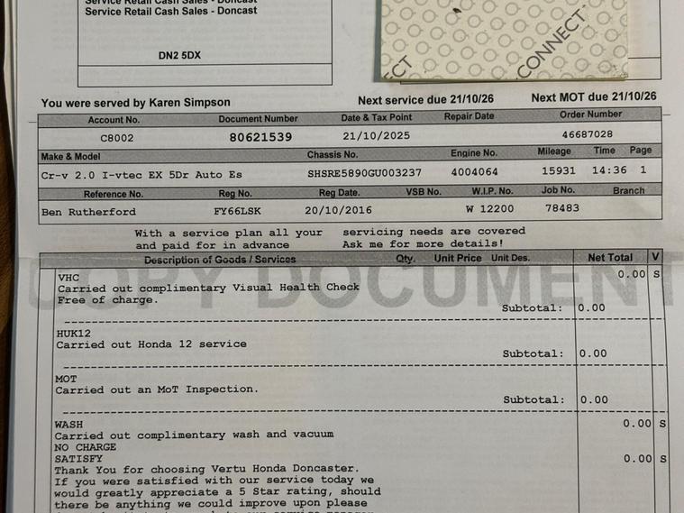 ++SUPER LOW MILEAGE++++FULL SERVICE HISTORY++COMES WITH:Iso fixElectric seatHeated seatSat navPan roofPrivacy glassUsb portBluetoothElectric BootReversing cameraParking sensors Electric windows Dab radioTmpsMulti functional steering wheelAdjustable headlightAlloys wheelsSteering wheel adjustment Towbar/electricAuto start/stopAuto wipersKeyless entray/start cruise controlDouble pan roofMemory seatsThis 2016 Honda CR-V i VTEC EX presents an exceptional opportunity with its remarkably low mileage of just 16162 miles, having been cherished by only one owner since new. This Four Wheel Drive model boasts a 2.0L petrol engine and meets Euro 6 emissions standards. Inside, you will find a host of desirable features designed for comfort and convenience, including heated front seats, dual zone climate control, and smart keyless entry and start. The adaptive cruise control makes longer journeys more relaxed, while the rear parking camera aids in manoeuvring.The generous boot space in this CR-V is a significant advantage, offering ample room for shopping, luggage, or sporting equipment. The combination of its low mileage, single owner history, and the premium EX trim level with its advanced features clearly sets this Honda CR-V apart from other vehicles of its age and type, offering a well maintained and highly equipped driving experience..