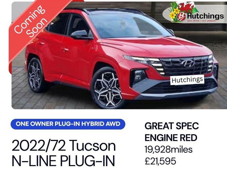 Hello and thank you for taking the time to view our vehicle listing. This is a Hyundai Tucson 1.6 T-GDi 13.8kWh Plug-in Hybrid N Line 4WD Automatic, finished in striking Engine Red with contrasting Black Roof, and having covered just 19, 928 miles from new. This is a one owner vehicle, presented in superb condition throughout and clearly very well cared for. Powered by the 1.6 T-GDi petrol engine combined with a 13.8kWh battery and electric motor, this Plug-in Hybrid produces an impressive 265PS and benefits from Hyundai’s intelligent 4WD system. It offers strong, confident performance while still delivering excellent efficiency. With an electric-only range of up to approximately 38 miles (WLTP), many daily commutes can be completed purely on electric power when charged regularly. In hybrid mode, it offers outstanding combined fuel economy of up to 201 MPG (WLTP), making it a superb option for reducing running costs without compromising on space or practicality. As an N Line model, this Tucson benefits from sporty styling enhancements both inside and out, including distinctive N Line exterior detailing, larger alloy wheels, sports seats and premium interior finishes. It also features a large touchscreen infotainment system with Apple CarPlay and Android Auto, dual zone climate control, heated seats, advanced driver assistance systems, rear parking sensors with reversing camera, and a host of safety features designed to make every journey comfortable and secure. The Tucson Plug-in Hybrid is ideal for customers looking to combine electric driving for everyday journeys with the reassurance of petrol power for longer trips. With generous boot space, elevated driving position and bold design, it remains one of Hyundai’s most desirable SUVs. This vehicle also benefits from the balance of Hyundai’s 5 Year Unlimited Mileage Warranty for additional peace of mind. Contact us today to request your personalised video walkaround or to reserve this fantastic example. ?.