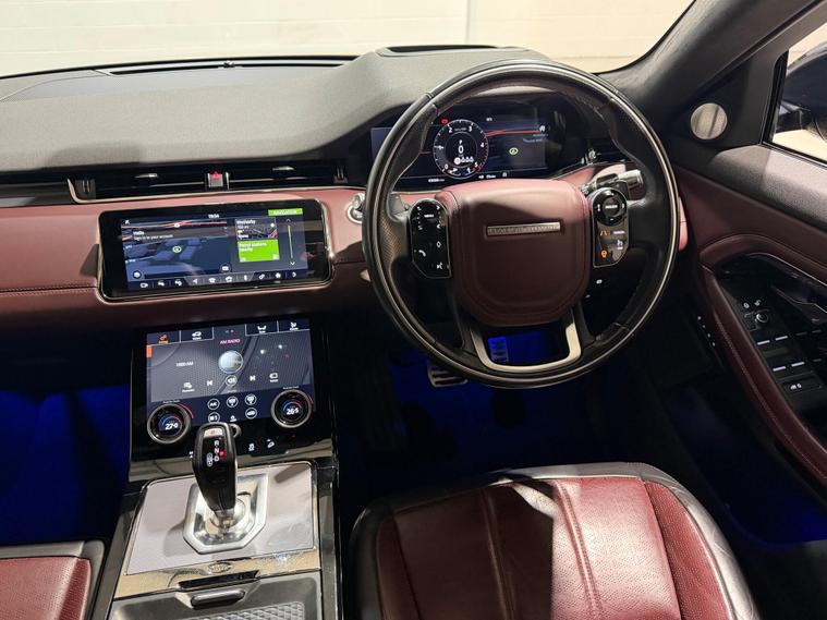 FULL SERVICE HISTORY, PANORAMIC TILT AND SLIDING SUNROOF, MERIDIAN SURROUND SOUND SYSTEM, HEADS UP DISPLAY, BURGUNDY LEATHER & MEMORY SEATS, HEATED & COOLED SEATS WITH MASSAGE, FRONT CLIMATE WINDSCREEN, ELECTRONIC TOWBAR, LAND ROVER PLUG IN PORTABLE FRIDGE, HEATED STEERING WHEEL, LANE ASSIST, ADAPTIVE CRUISE CONTROL, 360 CAM, BLIND APOT ASSIST, FOLDING MIRRORS, LED SIGNATURE HEADLIGHTS, BLACK PACK, 2 KEYSThis 2019 Land Rover Range Rover Evoque D240 R Dynamic HSE presents exceptionally low mileage for its age, having covered just 36, 000 miles. This sophisticated four wheel drive model is powered by a 2.0 litre diesel engine and meets Euro 6 emissions standards. It boasts a premium R Dynamic HSE trim, enhanced with a full extended leather upgrade and a striking black contrast roof. For practicality, it includes a detachable towbar with Advanced Tow Assist, and for an immersive audio experience, a Meridian Surround Sound System delivering 825W.The Evoque R Dynamic HSE offers a compelling blend of performance and refinement, accelerating from 0 to 60 miles per hour in a swift 7.2 seconds. This performance, combined with its advanced features like the Meridian sound system and the integrated towing capabilities, sets it apart from other vehicles in its class, offering a superior driving and ownership experience..
