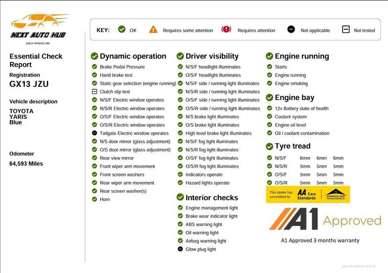 15 Services (13 main dealer services)This 2013 Toyota Yaris VVT-h T Spirit presents an exceptional opportunity with its MOT valid until December 2026 and a full service history, including a recent service on 2025-12-03 at 64, 300 miles. This 1.5L petrol hybrid model boasts low mileage for its age, having covered just 64, 750 miles, and comes with a 3 month warranty for your peace of mind. The T Spirit trim is enhanced by a Style Pack, a Toyota Touch and Go navigation system with Bluetooth connectivity, and a keyless entry system.Further enhancing your driving experience, this Yaris features a rear view camera with parking assistance and dual zone climate control for optimal comfort. Its low insurance group rating is a significant advantage, indicating that running costs are likely to be lower compared to similar vehicles. This combination of practical features, excellent provenance, and cost effective ownership makes this Toyota Yaris a compelling choice.3 Month Warranty 12 month AA Road side cover includedAA Dealer promise for quality cars and serviceWe guarantee you an absolutely clean title to the car, an outstanding maker may show up on the HPI report however this is commercial unit stocking finance which we have with our suppliers and is different to traditional consumer finance. Your invoice will confirm that this marker will be removed within 48 hours of your purchase.A complete health check is performed to ensure no surprises with the car, any test drive is welcome.At Next Auto Hub we make great effor to ensure that our cars are prepped to a high standard before these are made available for sale.Payment options:Bank Transfer (Preferred)Cash/Credit Card/Debit Card (These methods carry an additional surcharge of 1 dealer's website credit card (Visa/Mastercard and Amex) all carry a surcharge of 2.5%.