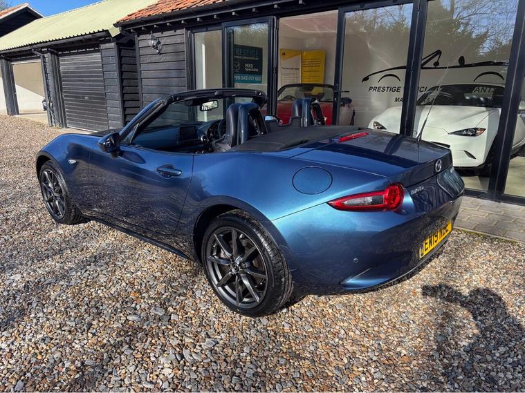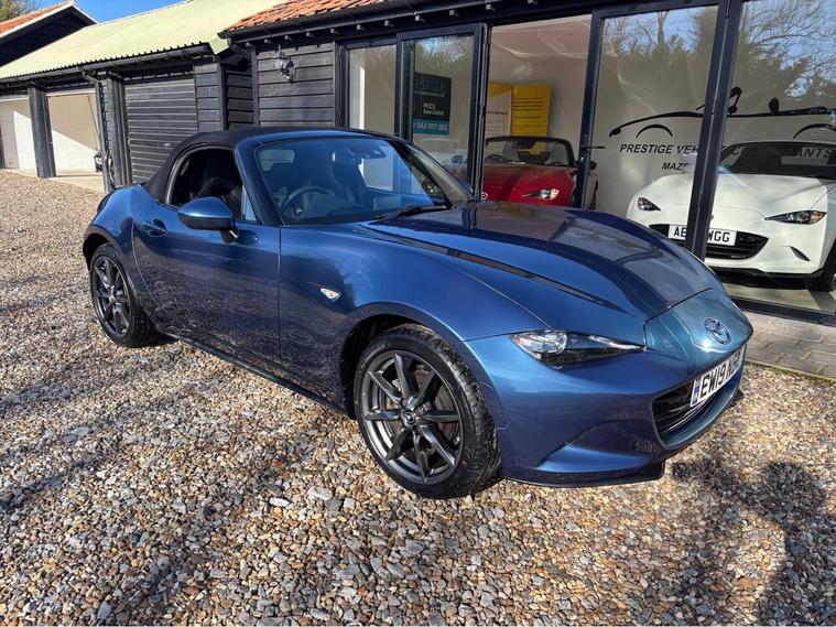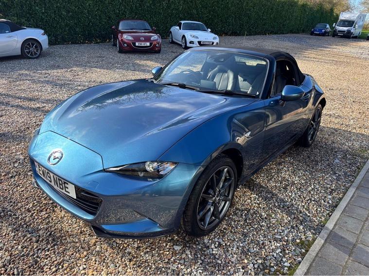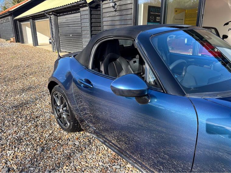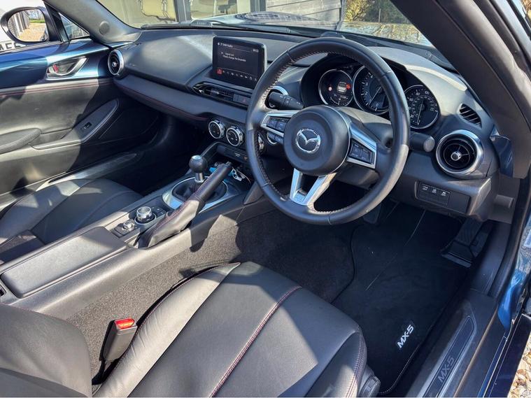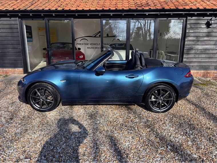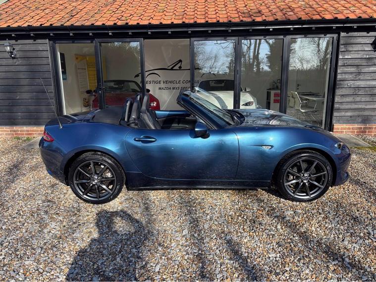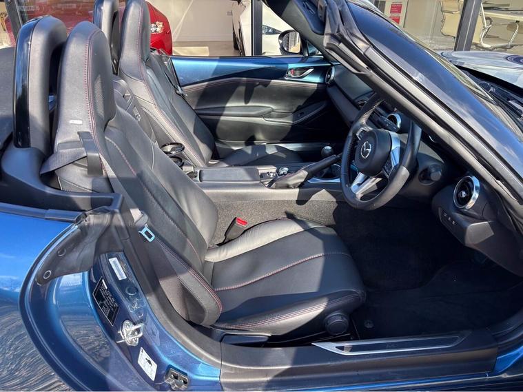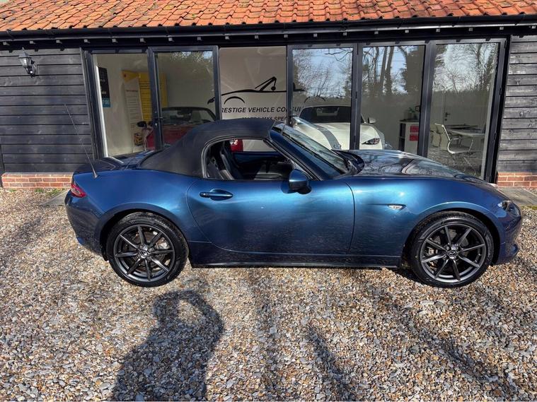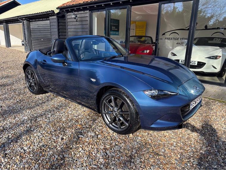 MAZDA + 1 OWNER ONLY 21, 000 MILES !! 6 MAIN DEALER SERVICES + GLEAMING ETERNAL BLUE METALLIC + FULL HEATED BLACK LEATHER SEATS+ HI SPEC+ 6 SPEED+ SAT NAV WITH APPLE CAR PLAY+ 17'' SHADOW CHROME ALLOYS+ REVERSING SENSORS+ CRUISE+ CLIMATE+ 2 KEYS+ VIEWING ESSENTIAL+ GREAT COLOUR COMBO+ BEST CHOICE OF QUALITY LOW MILEAGE MX5+''' PLEASE SEE OUR GOOGLE REVIEWS'' ALL MX5 FULLY PREPARED PRIOR TO DELIVERY.