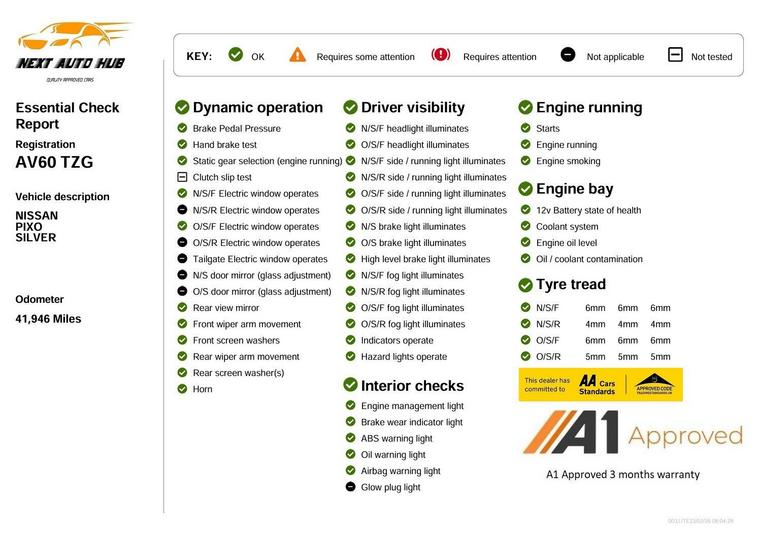 With an MOT valid until November 2026 and a clear vehicle history check, this 2010 Nissan Pixo n-tec offers peace of mind. This 1.0 litre petrol model has had only three owners and comes with a 3 month warranty for added security. Its partial service history includes a last service at 41, 986 miles on 4th March 2026, and it is equipped with air conditioning featuring a pollen filter.This Nissan Pixo n-tec stands out with its impressive fuel economy, achieving 54 miles per gallon, which is better than many similar vehicles. Its low CO2 emissions also contribute to its appeal, making it an economical choice. Furthermore, its low insurance group rating indicates that running costs are kept to a minimum, further enhancing its value for money.3 Month Warranty 12 month AA Road side cover includedAA Dealer promise for quality cars and serviceWe guarantee you an absolutely clean title to the car, an outstanding maker may show up on the HPI report however this is commercial unit stocking finance which we have with our suppliers and is different to traditional consumer finance. Your invoice will confirm that this marker will be removed within 48 hours of your purchase.A complete health check is performed to ensure no surprises with the car, any test drive is welcome.At Next Auto Hub we make great effor to ensure that our cars are prepped to a high standard before these are made available for sale.Payment options:Bank Transfer (Preferred)Cash/Credit Card/Debit Card (These methods carry an additional surcharge of 1 dealer's website credit card (Visa/Mastercard and Amex) all carry a surcharge of 2.5%.