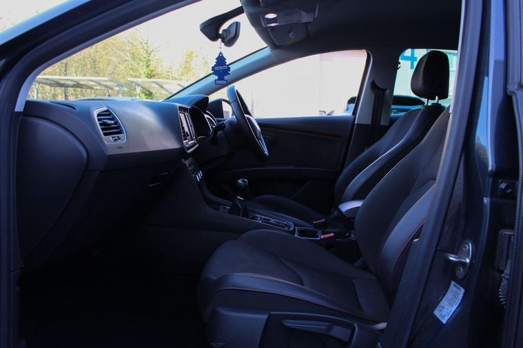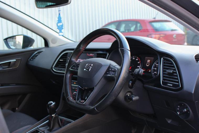 - Steering Wheel - Flat-Bottomed Perforated Leather with Red Stitching and FR Logo