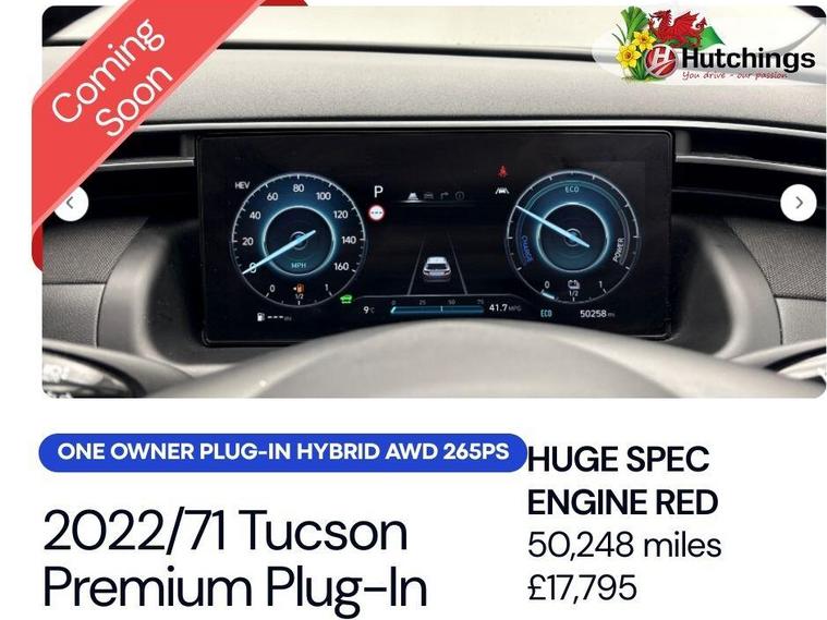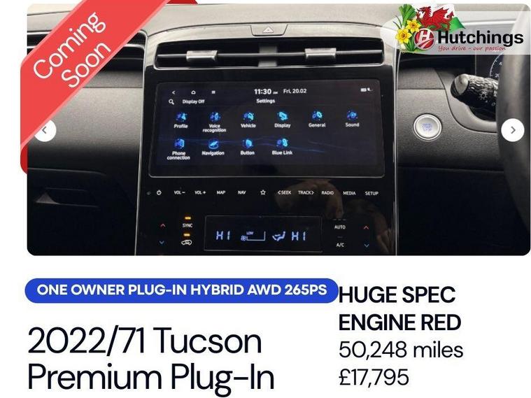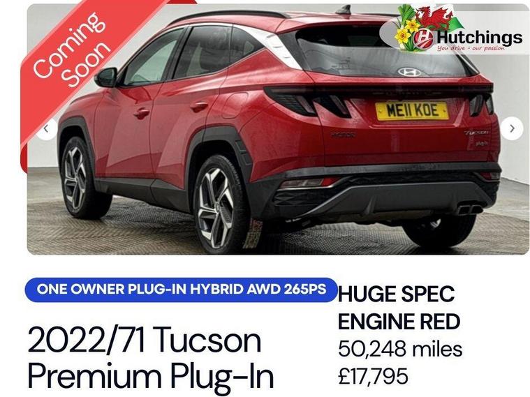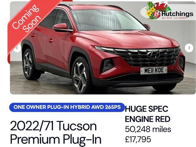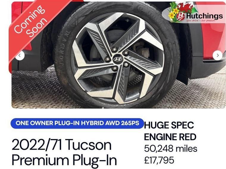Hello and thank you for taking the time to view our vehicle listing.This is a Hyundai Tucson 1.6 h T-GDi 13.8kWh Plug-in Hybrid Premium 4WD Automatic, finished in striking Engine Red and having covered 50, 248 miles from new. This is a one owner vehicle, presented in excellent condition and maintained to a high standard.Powered by the 1.6 T-GDi petrol engine combined with a 13.8kWh battery and electric motor, this Plug-in Hybrid produces an impressive 265PS and benefits from Hyundai’s intelligent 4WD system. The result is strong performance with smooth automatic driving, while still offering excellent efficiency. With an electric-only range of up to approximately 38 miles (WLTP), many daily journeys can be completed on electric power alone when charged regularly. When operating in hybrid mode, the Tucson can achieve combined fuel economy figures of up to 201 MPG (WLTP), making it an excellent option for reducing fuel costs without sacrificing the practicality of a larger SUV.As a Premium specification model, this Tucson comes very well equipped with a large touchscreen infotainment system with Apple CarPlay and Android Auto, digital driver display, dual zone climate control, heated front seats, keyless entry with push button start, rear parking sensors with reversing camera, automatic headlights and wipers, and a full suite of Hyundai SmartSense safety features including lane keep assist and forward collision avoidance assist.The Tucson Plug-in Hybrid is ideal for customers who want the benefits of electric driving for everyday use, while still having the flexibility of a petrol engine for longer journeys. With its bold design, spacious interior and excellent levels of comfort and technology, it remains one of Hyundai’s most desirable SUVs. It also benefits from the remainder of Hyundai’s 5 Year Unlimited Mileage Warranty for added peace of mind.Fully inspected by our Hyundai trained technicians and prepared to the highest standard, this vehicle is ready for its next owner. Contact us today to request your personalised video walkaround or to reserve this.