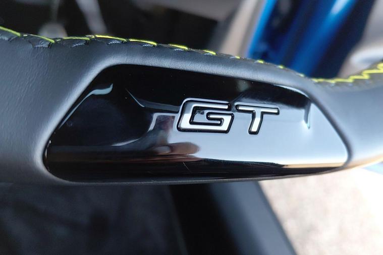 - Multifunction Full Grain Perforated Leather Steering Wheel with Adamite Green Stitching and GT Emblem