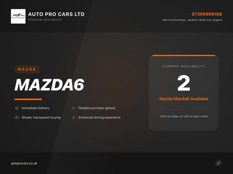 Vehicle Details2016 Mazda Mazda6 SKYACTIV-D Sport Nav2.2L Diesel EngineEuro 6 (ULEZ compliant)Only 2 previous ownersMOT valid until March 2027Clear vehicle history check (HPI clear)Well maintained exampleDrives smoothly with no issuesExcellent fuel economy – up to 64 MPGLow CO₂ emissionsLow insurance groupVery economical to runReliable and practical family saloonComfortable and refined driveGreat balance of performance and fuel efficiencyIdeal for commuting or long journeysReady to drive away – viewing and test drives welcome.