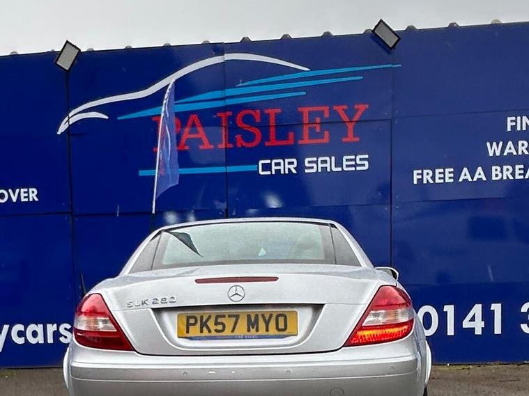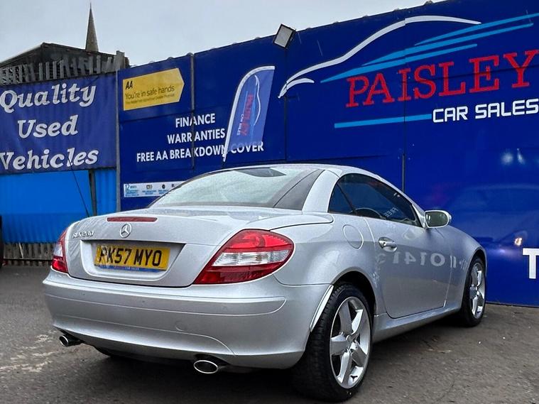 Mercedes Benz SLK, 2dr, Low Mileage , Full Service History, ULEZ Compliant? Mileage: 77, 352 (Warranted)? Service History: Full Service? MOT Valid Until: Full 12 months? Keys: 2 Keys? ULEZ Compliant: Yes (Euro 6)? Warranty: 12Months Included This exceptionally well-maintained Mercedes SLK is in outstanding condition inside and out, boasting a great specification from the factory, including:✅ Electric Windows & Mirrors✅ Parking sensors✅ Auto Lights✅ Central Locking✅ Air Conditioning✅ Daytime Running Lights✅ Steering Wheel Mounted Controls✅ HPI Clear – All Documentation PresentQuality Assurance & Extra Benefits:Finance Available – Competitive finance options to suit your budget.Part Exchange Welcome – Get a fair valuation for your current vehicle.AA Approved Dealership – Buy with confidence.Drive Away Same Day – 5-Day Insurance Available Courtesy of the AA.Free Home Delivery – Up to 25 miles for online orders.Flexible Payment Options – We accept all major debit cards.About Paisley Car Sales :We are a trusted, Renfrewshire-Based used car dealership, dedicated to providing high-quality vehicles and outstanding customer service. If this vehicle doesn’t meet your needs, we can source one to your specifications.? Visit Us: Office 2, Wellington street, Paisley, Renfrewshire, PA3 2JQ? Call Us: 01410022098? Website: dealer's website this exclusive web-discounted price while it lasts! Contact us today for more details or to book a test drive. ?Here at Paisley Car Sales we are always ready to go the extra mile. Don't hesitate to contact us!Vehicle registered: 27/09/2007Buying with Paisley Car Sales Ltd:Welcome to Paisley Car Sales, are a small family run used dealership. We hope you enjoy your experience with us, we encourage you to browse our current stock of cars and if there is nothing that jumps out to you, we are more than happy to source a vehicle on your request. Feel free to get in touch.