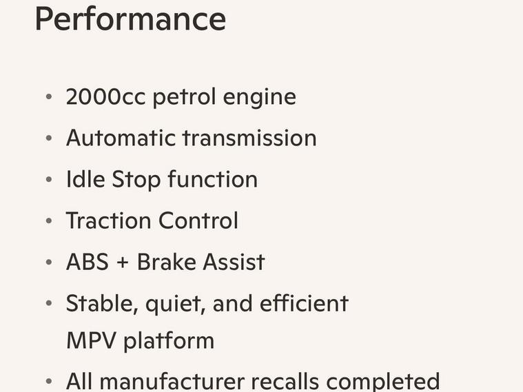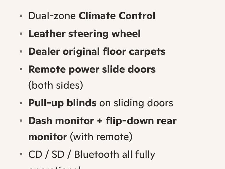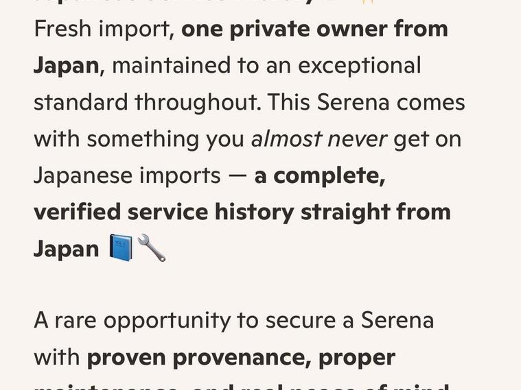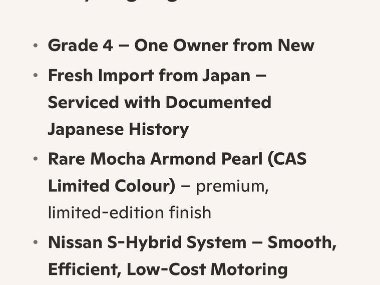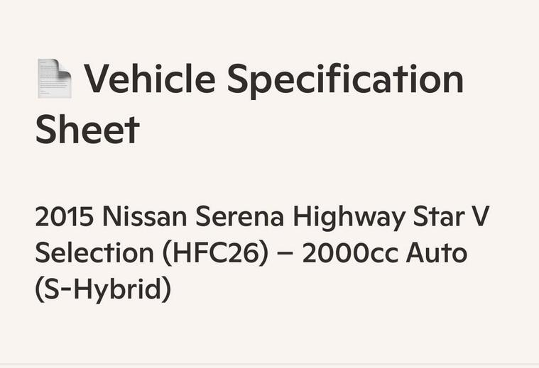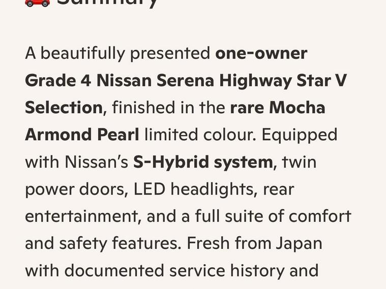 This is an exceptional example of the Nissan Serena HFC26 Highway Star V Selection, presented in the rare and highly sought-after Mocha Almond Pearl CAS limited color. This Grade 4 vehicle was a one-owner car in Japan and has covered just 64, 428 verified miles. It represents a clean, well-maintained example of this versatile 8-seater family hybrid.The V Selection trim offers a high level of factory specification designed for comfort and safety. The exterior features LED headlights, front fog lights, privacy glass, winker mirrors, and factory alloy wheels. The cabin environment is enhanced by dual-zone climate control, a leather-wrapped steering wheel, and original dealer floor carpets. For passenger entertainment, the vehicle is equipped with a dashboard monitor and a flip-down rear screen with remote control, with full CD, SD, and Bluetooth functionality.Safety and driver assistance features include cruise control, traction control, lane departure warning, and the idle-stop function for improved fuel efficiency. The vehicle also features remote power sliding doors with integrated pull-up sunblinds for rear passengers and two original intelligent keys.At Wanstead Carriages, we ensure every vehicle is retail-ready to the highest standard. This Serena has passed a fresh MOT with no advisories and has undergone both a full engine service and a crucial transmission service. Extended road testing confirms the automatic gearbox delivers seamless changes and the engine performs optimally with no warning lights. A verified VX report and full HPI check are provided to confirm no mileage discrepancies or hidden accident history. All manufacturer recalls have been completed.The purchase includes a 12-month nationwide Premier Warranty covering over 8000 mechanical and electrical components. Additionally, the vehicle comes with 12 months of AA Breakdown Cover and a rigorous multi-point inspection. We operate under the AA Cars Standards, approved by the Chartered Trading Standards Institute. This vehicle is fully ULEZ compliant.Stock ID: IM455.