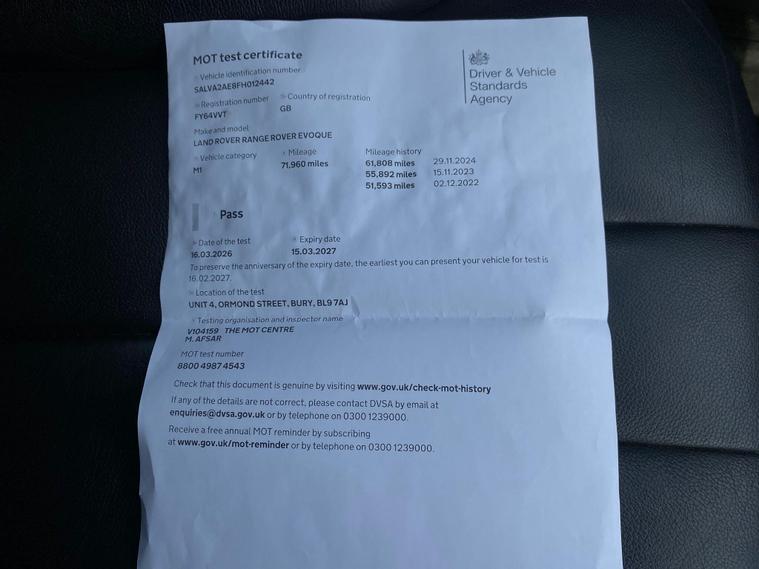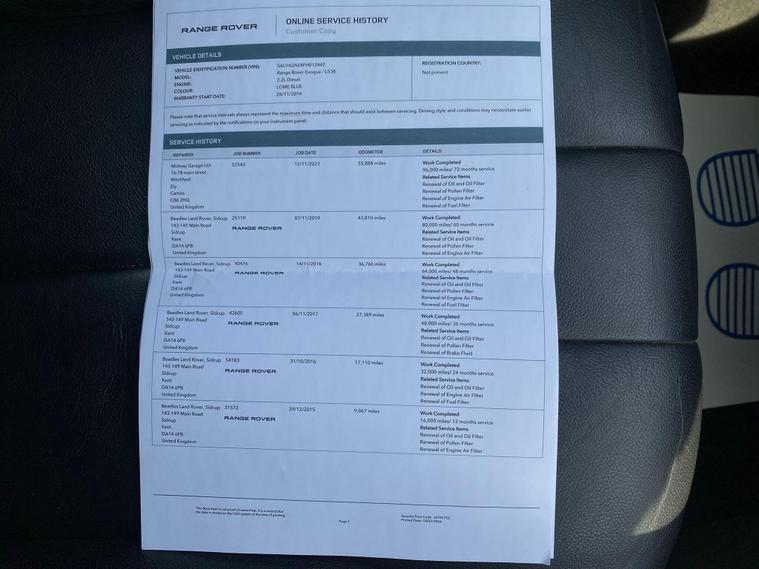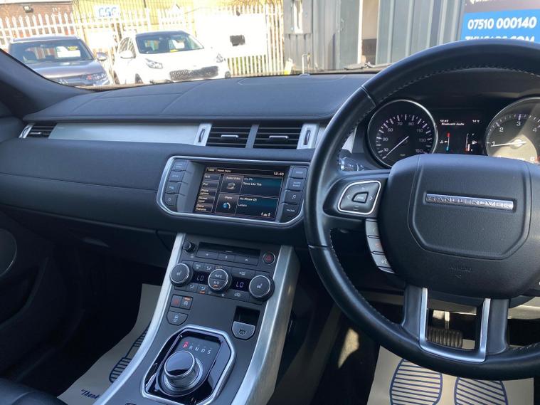With only 71962 miles on the clock, this 2014 Land Rover Range Rover Evoque SD4 Pure represents exceptional value. This four wheel drive model, featuring a 2.2L diesel engine, has been cherished by just two owners. Its Pure trim level is enhanced by a Corris Grey contrast painted roof and matching spoiler, along with privacy glass for added discretion.Experience superior sound with the 825W Meridian Surround Sound System, featuring 17 speakers and a 7 inch touch screen. Parking is made effortless with front parking aid and assistance sensors. The Evoque also boasts a generous boot space, perfect for all your needs, and its impressive 0-60mph acceleration in just 8.0 seconds demonstrates its dynamic performance, setting it apart from other vehicles in its class..