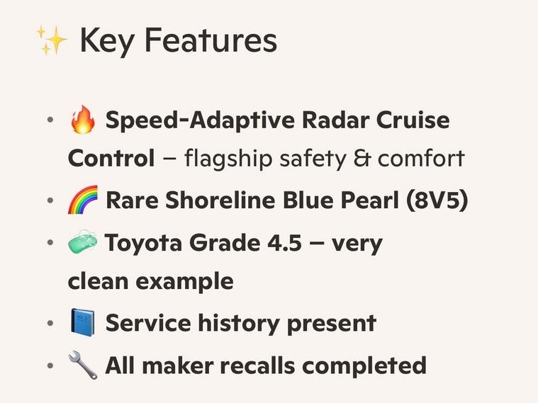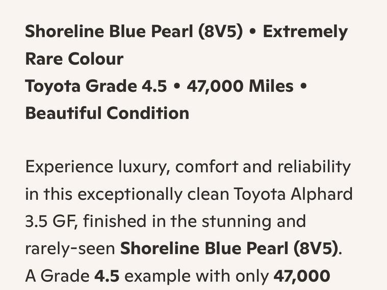 2015 (Sep) Toyota Alphard 3.5 GF (GGH30) finished in the rare and desirable Shoreline Blue Pearl (8V5). This is a Toyota Grade 4.5 example and is in very clean condition throughout. Powered by the smooth 3.5 V6 petrol engine with automatic transmission. Covered 47, 000 miles (77, 000 km) with service history present. All manufacturer recalls have been completed.The specification includes LED headlights and LED fog lights, winker mirrors, privacy glass, rear spoiler, remote power slide doors on both sides, remote power rear gate and a rear camera. Factory standard 17-inch alloy wheels fitted with 2024 radial tyres. All-round parking sensors are also fitted.Inside, the vehicle benefits from full beige leather interior, heated front seats, power assist front and centre seats, memory position driver seat, heated steering wheel, dual climate control and pull-up sunshades on all rear windows. Dealer original floor carpets are present.Technology features include dashboard monitor, flip-down rear monitor with rear remote, CD, SD and Bluetooth all working, plus two smart keys.Safety and driver assistance features include Speed Adaptive Radar Cruise Control, PCS, ABS, traction control, front, side and curtain airbags, auto wipers and auto headlights with auto high-beam.This vehicle has just been MOT’d and has received an engine service and transmission service with no advisories. It drives exactly as it should with no warning lights on the dashboard. The engine is smooth and the automatic gearbox delivers seamless gear changes.A verified VX report is supplied, confirming no mileage discrepancies or hidden accidents. The price includes 12 months nationwide comprehensive Premier warranty from a leading UK warranty provider, covering over 8000 mechanical and electrical components, including parts and labour. AA/RAC inspections are welcome and 12 months AA breakdown cover is included.We are proud to operate under the AA Cars Standards, approved by the Chartered Trading Standards Institute, giving you complete confidence when purchasing from Wanstead Carriages..