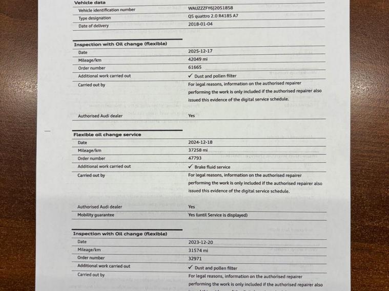 Right Track Cars Ltd are a well established, family run business known for the quality of our vehicles and our friendly and professional customer service. With very low mileage for its age, this beautifully maintained 2018 Audi Q5 2.0 TFSI Sport S Tronic Quattro presents a compelling proposition. This Four Wheel Drive model, powered by a 2.0L Petrol Engine, meets Euro 6 emissions standards and boasts a substantial towing weight of 2400 kg. This car also benefits from a full Audi dealership service history, a clear vehicle history check, and an MOT valid until January 2027. The vehicle has covered just 42, 633 miles, with its last service performed by Audi on 17/12/2025 at 42, 049 miles. For your peace of mind, a comprehensive, nationwide 6 month RAC warranty and 12 months RAC breakdown cover are included.This Audi Q5 TFSI Sport is equipped with notable features designed to enhance your driving experience. These include Xenon Headlights with LED Daytime Running Lights for superior visibility, and full leather upholstery with heated front seats for comfort in all conditions. Parking is made easier with the Audi Parking System Plus, offering front and rear sensors, while the Bluetooth Interface and Audi Smartphone Interface allow for seamless connectivity. Satnav and a power operated tailgate are also provided. The impressive acceleration of 0-62mph in just 6.3 seconds demonstrates its dynamic performance, and the large boot space offers practicality for all your needs, setting it apart from other vehicles in its class. **OWN THIS CAR FOR £396 A MONTH, SEE IMAGES FOR DETAILS**. 10.9% APR (TYPICAL) SAME DAY FINANCE AVAILABLE. Great value RAC extended warranties available. We are open Monday to Saturday from 9.30 - 5.00 (4.00 on Saturdays). Please call us on 01425317413 or e-mail us at righttrackcars dealer's website to arrange your viewing and test drive, or call in at your convenience.**Right Track Cars have been awarded Auto Trader's coveted Highly Rated for Customer Service Award many times and proudly hold a 4.9* average Customer Review Rating on Auto Trader / Feefo.**.