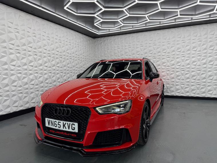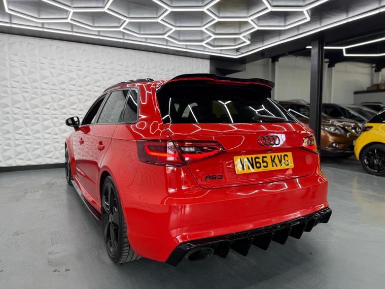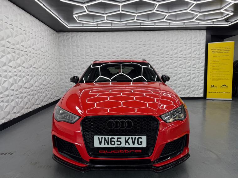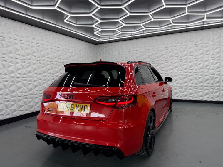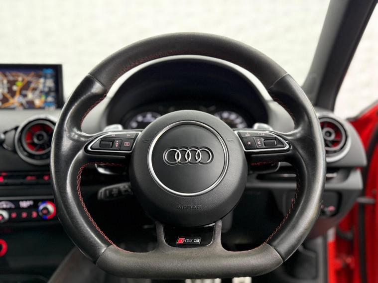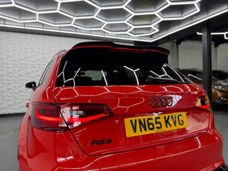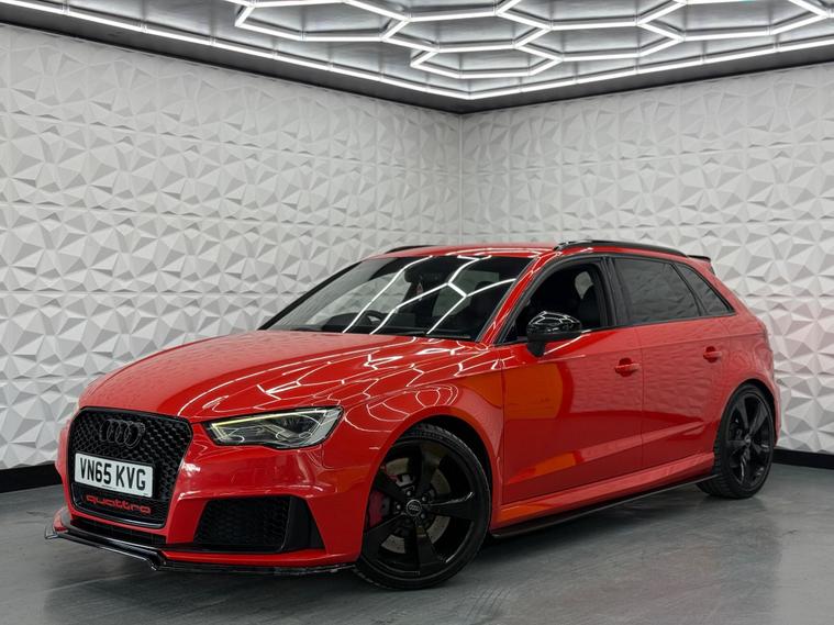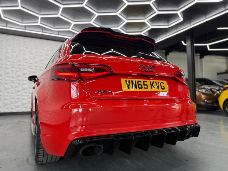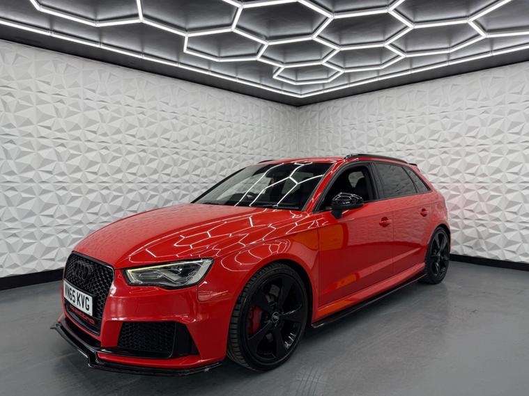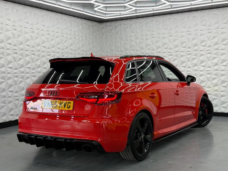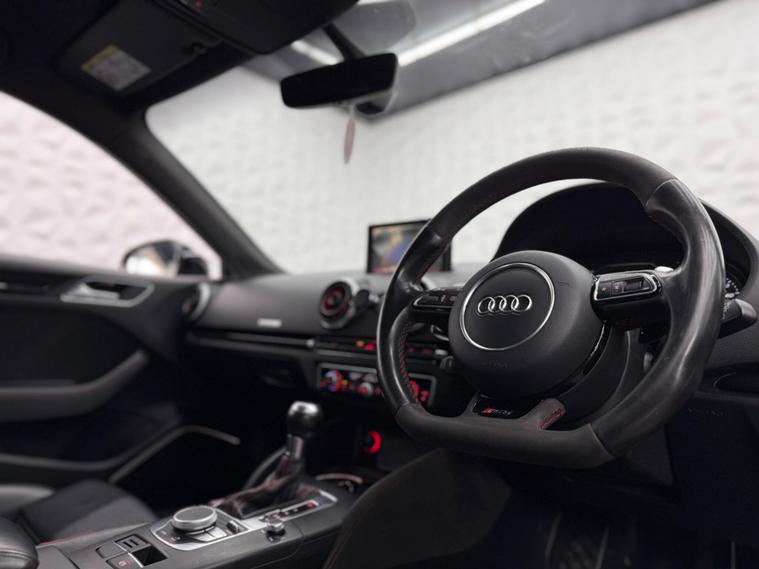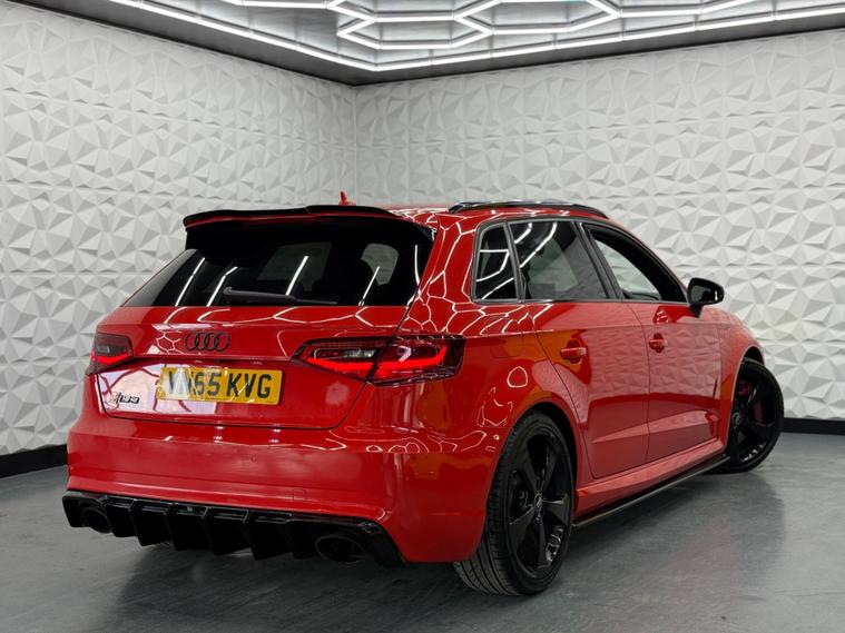 This Audi RS3 TFSI from 2015 offers exceptional peace of mind with an extended Audi Warranty, valid for 60 months or 90, 000 miles, including unlimited mileage for the first 24 months, and benefits from a clear vehicle history check. This powerful four wheel drive model features a 2.5 litre petrol engine and meets Euro 6 emissions standards. Inside, you will find luxurious Fine Nappa leather RS Super Sports seats in black with striking Crescendo Red stitching and an RS3 logo, complemented by a high gloss black styling package and black roof rails.Experience exhilarating performance with this RS3, capable of accelerating from 0-62mph in just 4.3 seconds, a highlight that demonstrates its superior capability compared to many other vehicles. The inclusion of a rear view camera with parking assistance further enhances its practicality and ease of use, making this a compelling choice for those seeking both performance and sophisticated features..