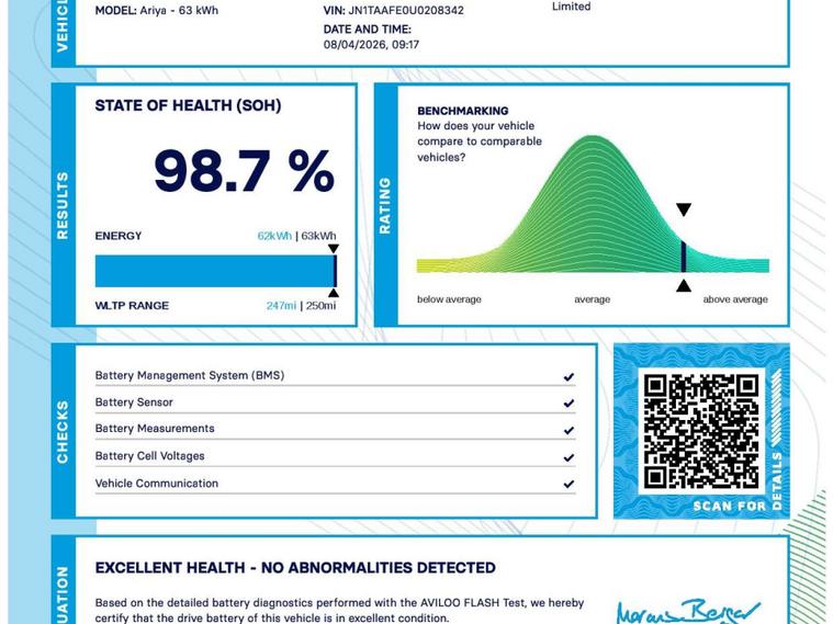 Introducing the Nissan Ariya 63kWh Advance SUV, a stunning electric vehicle that combines cutting-edge technology with eco-friendly performance. Finished in a sleek Green colour, the Nissan Ariya is sure to turn heads wherever you go. But it's not just about looks - this SUV packs a punch with its 217 ps power output, delivering a smooth and powerful driving experience.Equipped with a 7.4kW charger, you can easily top up the battery and keep the adventure going. Plus, with advanced features and spacious interior, the Nissan Ariya offers comfort and convenience for every journey.Don't miss out on the opportunity to own this exceptional Nissan Ariya. Visit us today and experience the future of driving for yourself. For peace of mind this vehicle has completed a multi point AA dealer's website finance is also available.We are open 7 days a week and have more than 1500 cars to choose from.All our Euro 4 Petrol and Euro 6 Diesel vehicles meet the ULEZ standard.Vehicle specification can be found below. From time to time vehicles have manufacturer recalls notified. Please read our recall policy on our website for further information. Please be advised that the advertised electric vehicle (EV) listings may experience battery degradation over time, resulting in reduced performance and range compared to the original specifications. Factors such as usage patterns, environmental conditions, and charging practices can contribute to this degradation. While we strive to provide accurate information, the actual battery health and performance of each EV may vary. Customers are encouraged to conduct thorough research and consider the potential impact of battery degradation before making a purchase decision. We recommend consulting with a qualified technician or conducting a battery health inspection for further assessment. This vehicle comes with an AVILOO Battery Health Certificate - the global standard for EV battery testing. Full independent analysis confirms excellent battery condition with detailed State of Health assessment, cell-level checks, and accurate range data. Certificate included with purchase for your complete peace of mind and future resale value.Disclaimer: While every effort is made to ensure the accuracy of vehicle specifications, features, and descriptions, errors and omissions may occur. Specifications and equipment may vary and may not be present on the vehicle at the point of sale. Buyers are advised to confirm all details with the seller before completing a purchase..