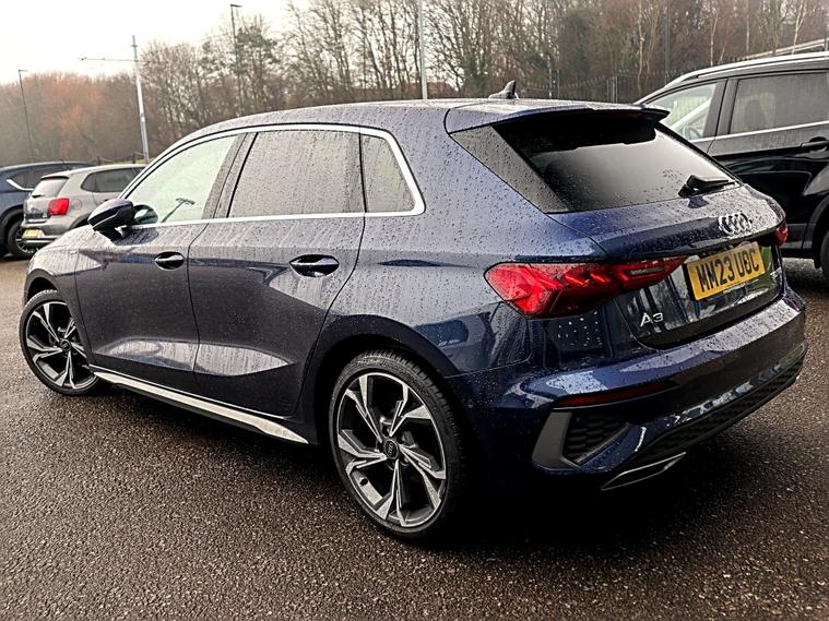 Smartly specified and stylish, this Audi A3 S Line Sportback blends everyday practicality with premium touches that make every journey feel special. The compact but spacious hatchback delivers a refined driving experience thanks to its smooth S tronic gearbox and an efficient TFSI engine that's ideal for city running yet composed on longer trips. Inside, the cabin is dressed in twin black leather with S embossing and inlays in dark spectrum aluminium, creating a sporty yet sophisticated atmosphere where heated seats and climate control keep comfort levels high in all seasons. Technology is second nature here, with satellite navigation, Apple CarPlay and Android Auto keeping your route guidance and media seamlessly integrated, while Bluetooth connectivity and a Park Cam work alongside parking sensors to take the stress out of tight spaces. Visually this car stands out in Navarra Blue metallic paint complemented by striking 18" graphite grey, diamond-cut 5-Y-spoke alloys that hint at the sharper S Line styling underneath. Practical elements such as electric mirrors and windows, central locking and cruise control add convenience on daily commutes or longer runs. Traction control and the car's composed chassis provide confidence through corners, while the tasteful S Line detailing elevates the overall presence. This vehicle offers a fine balance of performance, economy and premium specification, making it a compelling choice for anyone seeking a compact car with a genuinely upscale feel. LOOKING FOR SOMETHING SIMILAR? We have another 275 vehicles available on our website! Please contact us for more details.