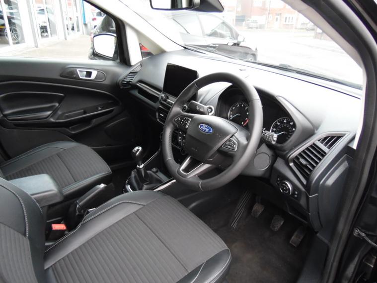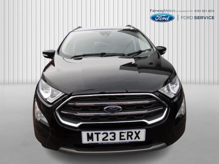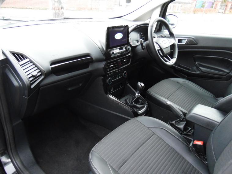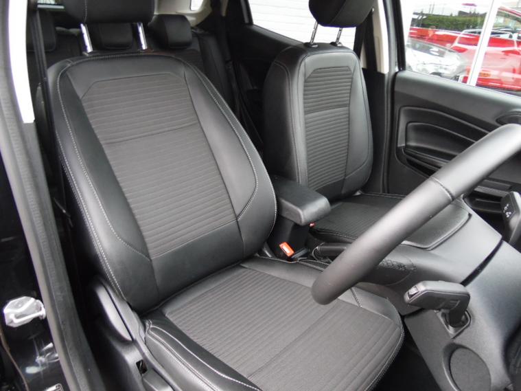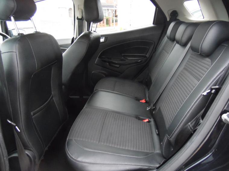 A stunning example of this much sought after Ecosport Titanium finished in Shadow Black metallic with charcoal half leather interior trim. It comes with a great specification including SATELLITE NAVIGATION, Reversing camera, Climate and cruise control, DAB radio with voice activate bluetooth, electric windows, remote central locking, privacy glass and alloy wheels. One owner from new with a Full Ford History it is incredibly good value for money, be quick if you want this one!!. Cruise control, Navigation system, Steering wheel audio controls, Travel data recorder, Trip computer, Windscreen heating, Ambient lighting, Audio remote control, Digital radio, Front centre armrest, Front head restraints, Front interior 12V power outlet, Rear headrests, Rear interior 12V power outlet, Steering wheel manually adjustable, Steering wheel rake adjustment, Steering wheel reach adjustment, USB input, Body coloured bumpers, Roof rails, Windscreen wash-nozzle heated, Alarm, Immobiliser, Remote central locking, Leather/Artificial leather seat upholstery, Partial leather seat upholstery, Premium Paint, 17'' Alloy wheels, Alloy wheels, . dealer's website HIRE PURCHASE AVAILABLE, PART EXCHANGE WELCOME. Call 01512972504
