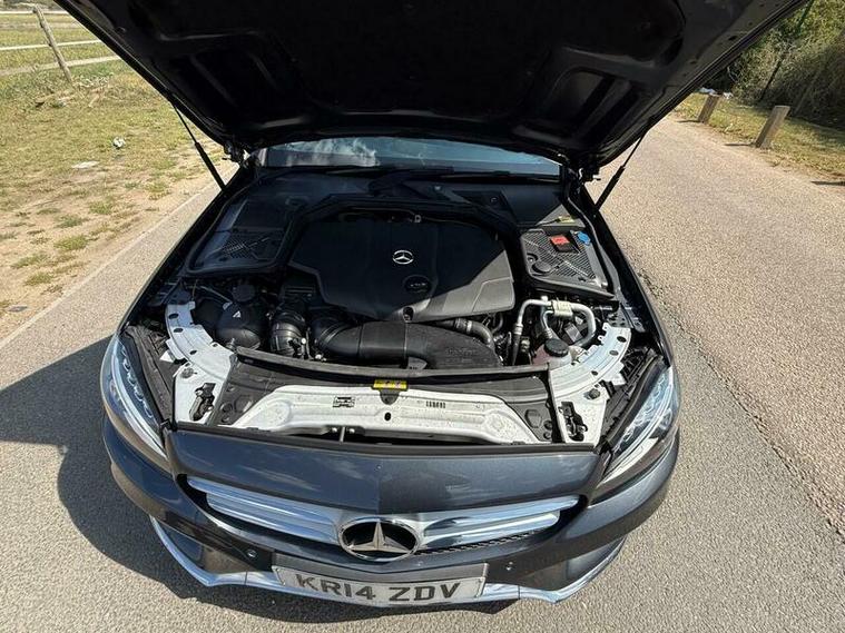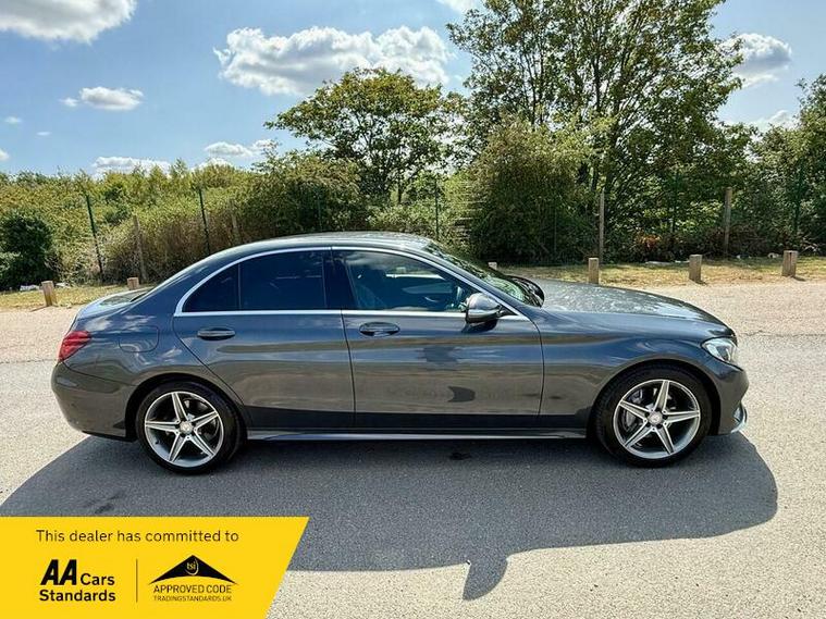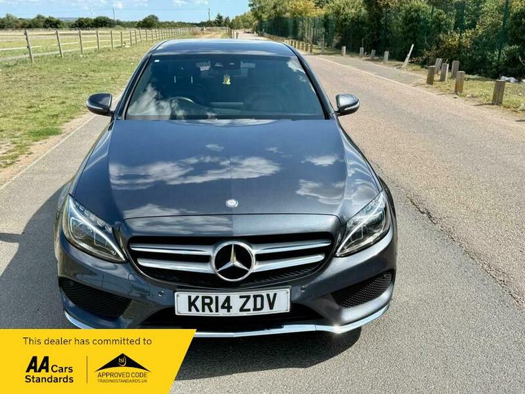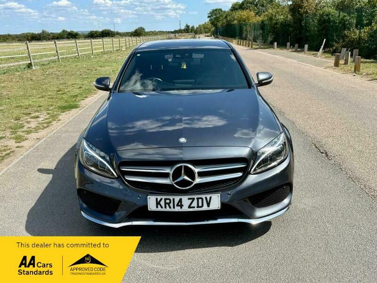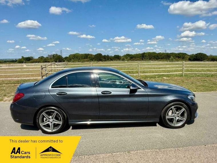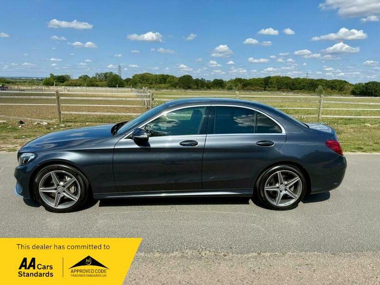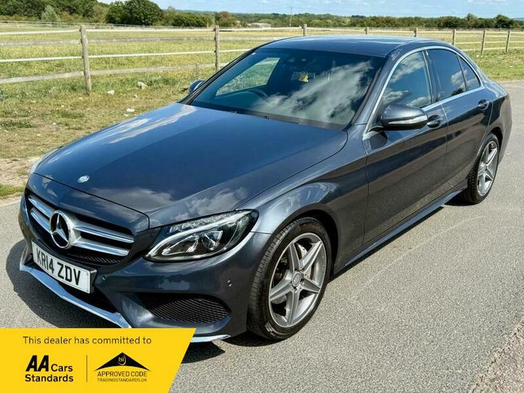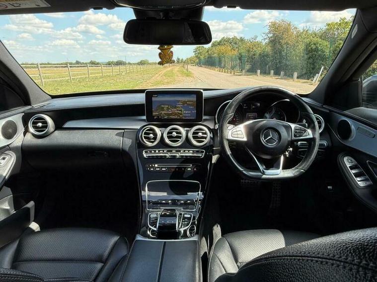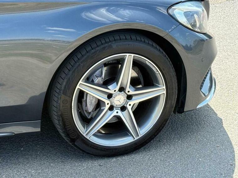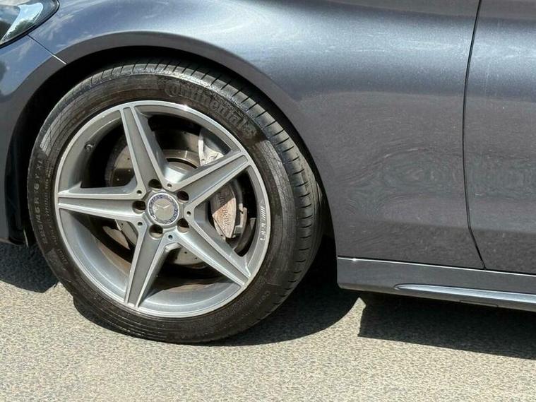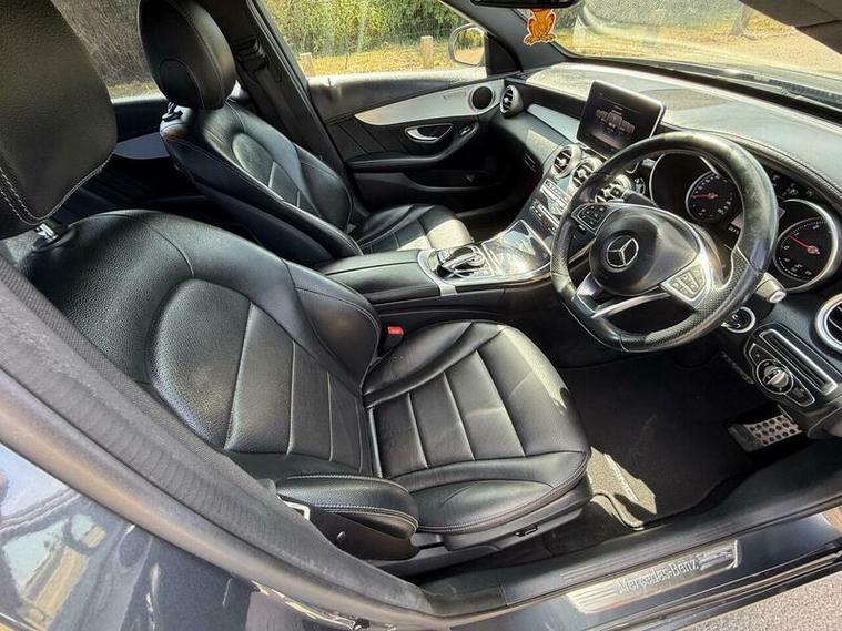 This is an excellent example of a Mercedes C-Class AMG Line in grey, featuring a black leather interior. The vehicle comes with partial service history and has just been fully serviced, with only one previous owner. It has an MOT valid until August 6, 2026, and includes two keys, as well as good tires all around.