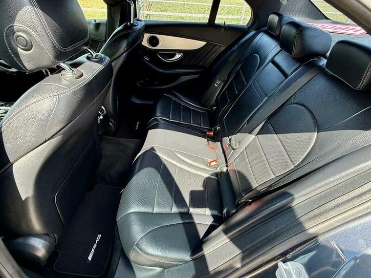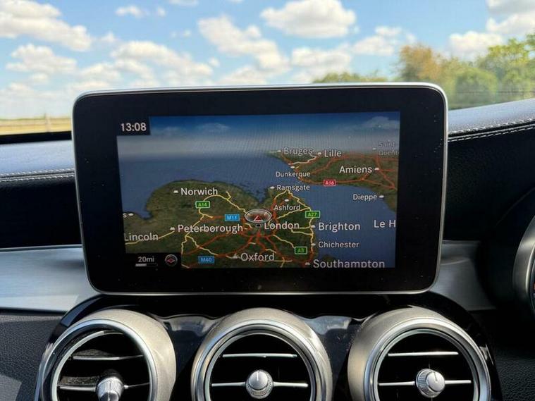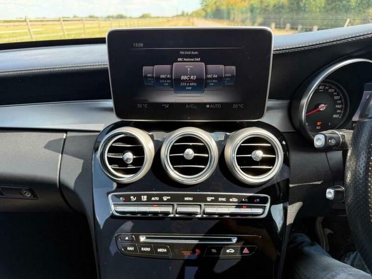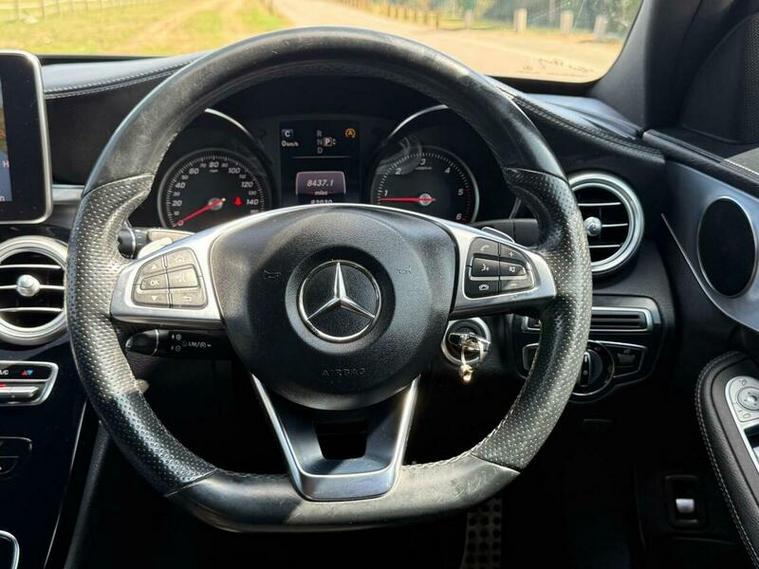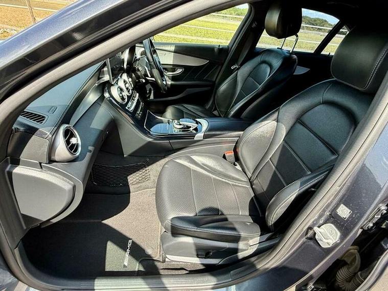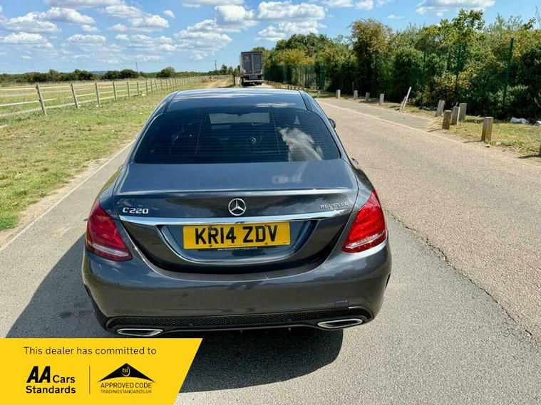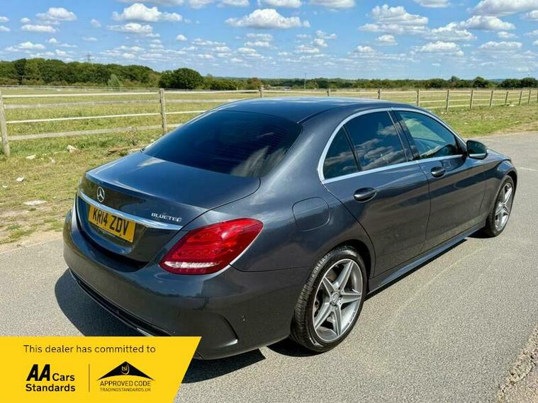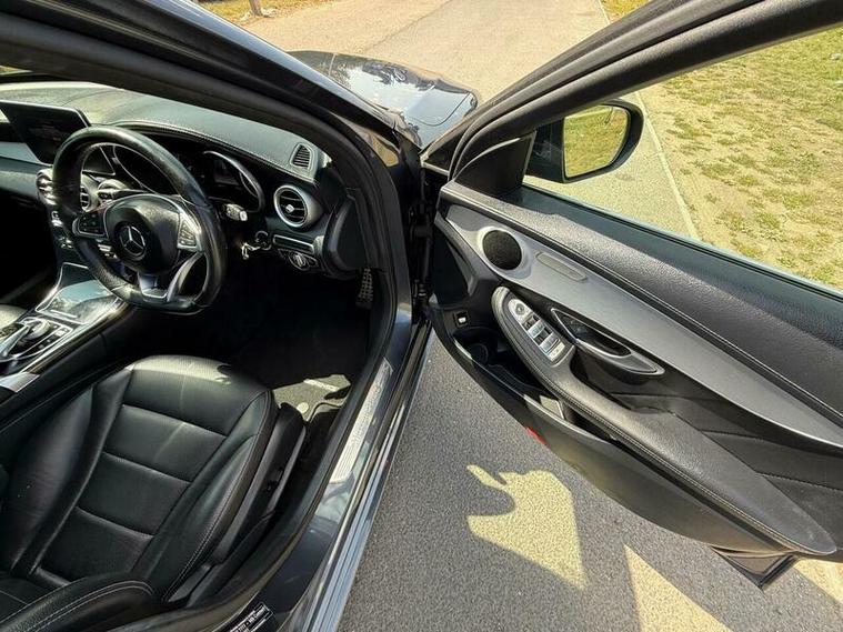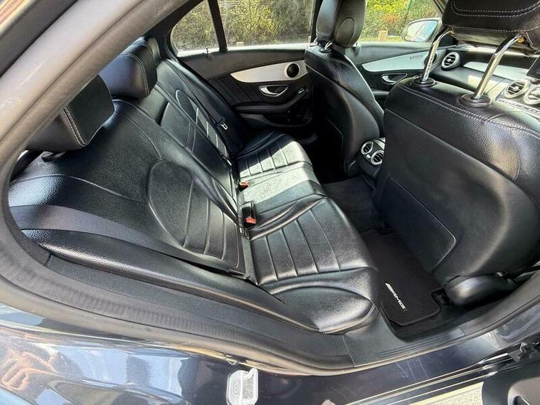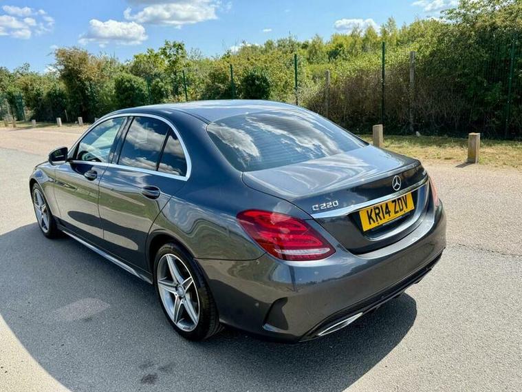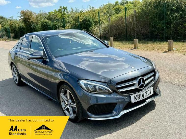 This is an excellent example of a Mercedes C-Class AMG Line in grey, featuring a black leather interior. The vehicle comes with partial service history and has just been fully serviced, with only one previous owner. It has an MOT valid until August 6, 2026, and includes two keys, as well as good tires all around.