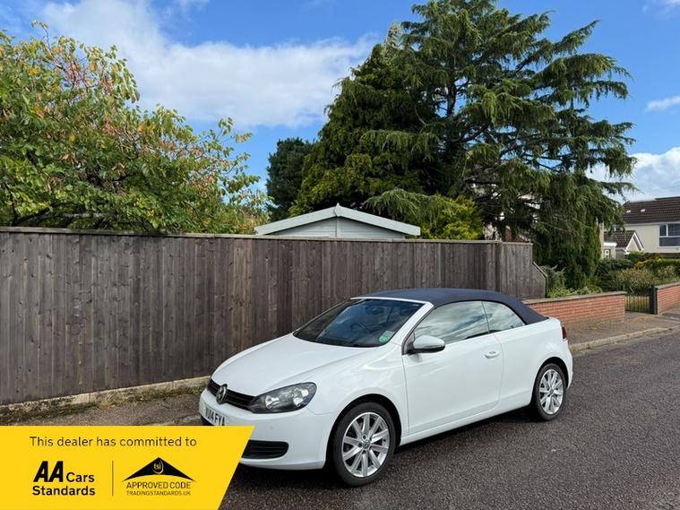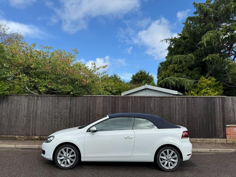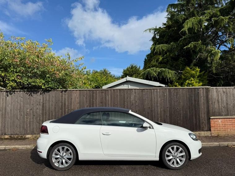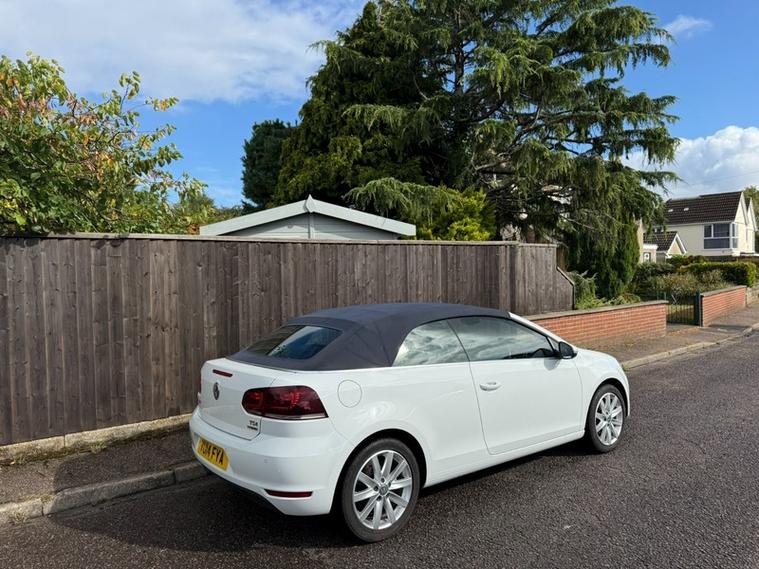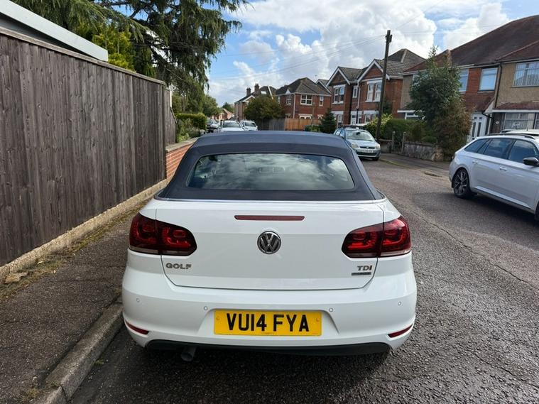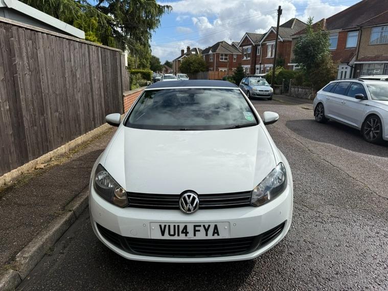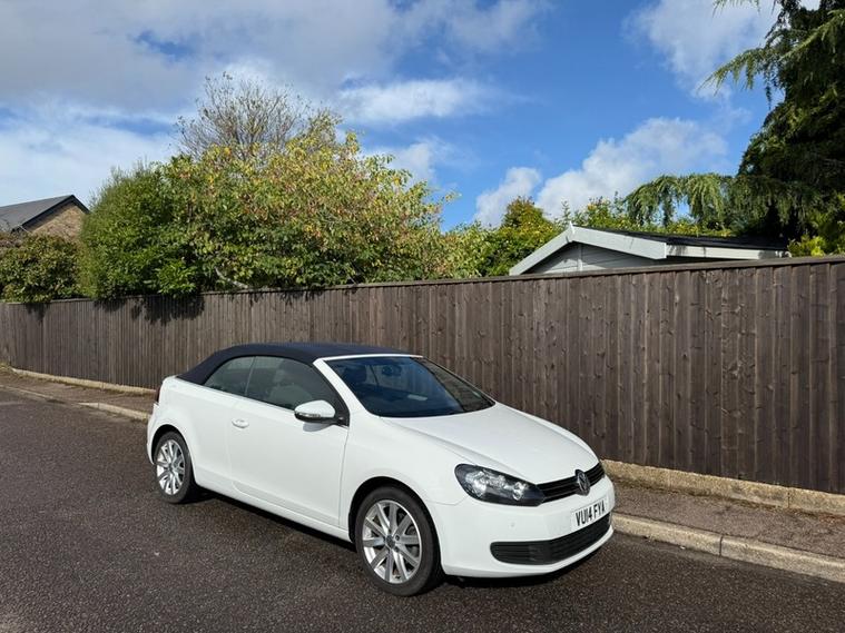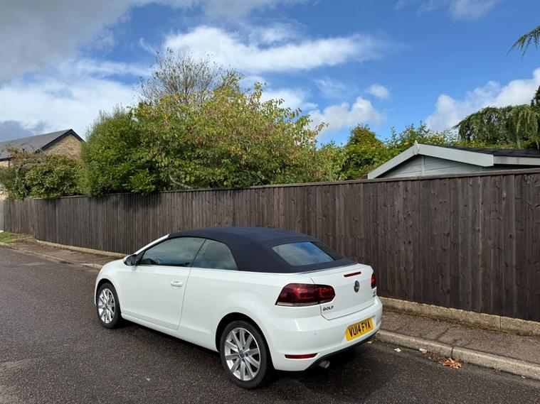 Volkswagen Golf 1.6 TDI SE Bluemotion Tech Convertible 2 Door Turbo Diesel in White. Registered on 27th March 2014 (14 plate). This well-maintained and economical convertible comes with just 33, 000 miles from new and benefits from full service history, including 8 service stamps and supporting maintenance invoices. The last service was completed on 6th of March 2025 at 32, 600 miles. Cambelt and water pump were replaced on 19th of January 2023 at 29, 600 miles.