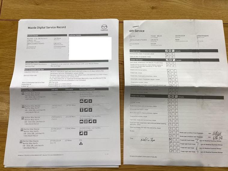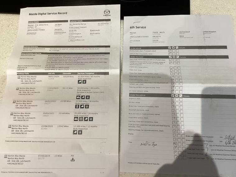 This car comes with 5 seats, Black, 1 owner, 17in Alloy Wheels - Gunmetal, ABS - Anti Lock Braking System, Active Bonnet, Advanced Smart City Brake Support, Air Conditioning - Dual Zone Climate Control, Auto Dimming Rear View Mirror, Blind Spot Monitoring with Rear Cross Traffic Alert, Bumper - Front Body Coloured with Black Lower Mouldings, Bumper - Rear Body Coloured with Black Lower Moulding, Colour Active Driving Display - Colour Head-Up Display, Colour TFT Display with Traffic Sign Recognition, Cruise Control with Adjustable Speed Limiter, DSC - Dynamic Stability Control, Daytime Running Lights, Door Mirrors - Electrically Adjustable - Heated - Auto Power Folding with Integrated Indicator Lights, Door Pockets - Driver and Front Passenger, Dual Chrome Exhaust Tailpipe, Dual Front Airbags, Dusk Sensing Automatic Headlights, EBD - Electronic Brakeforce Distribution, Electric Windows - Front and Rear with One Touch Auto Up and Down on Drivers Side, Electrical Power Outlet, Electronic Parking Brake with Auto Hold Function, Electronic Parking Brake with Auto-Disengage Function, Emergency Stop Signalling System - ESS, Emergency Tyre Repair Kit, Engine Start-Stop Button, Front Fog Lights - LED, Front Passenger Airbag Cut-Off Switch, Front Side Airbags, Front and Rear Courtesy Lamps, Front and Rear Curtain Airbags, Gear Shift - Leather-Wrapped, Glovebox Illumination, Grab Handles - Front Passenger and Two Rear with Coat Hooks, Grille - Gloss Black Finish, Headlights - Coming-Leaving Home, Headlights - LED with Auto Headlight Levelling, High Beam Control, Hill Hold Assist, ISOFIX Child Seat Anchorage for Outer Rear Seats, Integrated Bluetooth, Intelligent Speed Assist, Interior Courtesy Light with Integrated Spotlight, Lane Keep Assist System, Luggage Compartment - Light, Mazda Navigation System - European Mapping with Alternative Route Calculations - Point of Interest Search and 3-Years Free Map Updates, Multimedia Commander, Multimedia System, Overhead Console with Sunglassess Holder, Parking Sensors - Front and Rear, Power Steering, Privacy Glass - Rear and Rear Side Windows, Rain-Sensing Front Wipers, Rear Seats - 60-40 Fold Down Seats, Rear Seats - Three Height-adjustable Head Restraints, Remote Central Locking with Deadlocking and Automatic Door Lock when Driving, Seatback Pocket - Front Passenger, Seatbelt Reminder Audible Warning - Driver-Passenger and Rear Seat, Seatbelts - Front - 3 Point - ELR x 2 with Pre-Tensioners, Seatbelts - Rear - 3-Point - ELR, Seats - Drivers Manual Slide - Recline - Height and Lumbar Adjustment, Seats - Front Passenger Manual Slide - Recline and Height Adjustment, Steering Wheel - Leather Wrapped, Steering Wheel - Tilt and Height Adjustment, Storage Spaces - Two Cup Holders in Centre Console, Sun Visors - Drivers and Front Passengers, TCS - Traction Control System, Tail Lights - LED Rear Combination Lights with LED Rear Turn Lights, Thatcham Accredited Alarm and Immobiliser, Trip Computer,