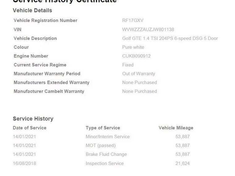 This car comes with 5 seats, White, 3 owners, 12V Socket - Luggage Compartment, 17in Alloy Wheels - Rio de Janerio, ABS - Anti-Lock Braking System with HBA - Hydraulic Brake Assist, Active Info Display, Adaptive Cruise Control, Aerofoil Downside Shiny Black, Airbags, Alarm, Ambient Lighting Pack, Auto-Fold Down Lever in Rear Seat Backrest, Automatic Coming-Leaving Home Lighting Function, Automatic Post-Collision Braking System, Bag Hooks in the Luggage Compartment, Black Door Cards, Body Coloured Bumpers, Body Coloured Door Handles, Body-Coloured Roof Spoiler - Rear, Brake Calipers - Blue, Brake Pad Wear Indicator, Car-Net App Connect, Carpet Mats, Centre Console - Piano Black, Charging Socket AC Type 2, Child Security Locks in the Rear Doors, Chrome Frame on Front Air Inlet Grille, Chrome Plated Air Vent Surrounds, Chrome Plated Applications - Mirror Switch - Window Switch, Climate Control, Composition Media System, Convenience Pack, Cover for Storage Compartment in Centre Console, Cup Holder - Closable Cover in Centre Console, Cup Holders - Front x2, Decor Strip on Dashboard - Decor Strip on Door Side Trim, Decorative Insert - Honeycomb Black, Driver Alert System, Driver Profile Selection, Drivers and Passengers Safety Optimised Head Restraints, Driving Profile Selection, Dusk Sensor - Automatic Driving Lights, Dust and Pollen Filter with Active Coal Insert, ESC - Electronic Stability Control including EDL - Electronic Differential Lock and ASR - Traction Control, Electric Rear Windows, Electric Windows - Front, Electronic Engine Immobiliser, Electronic Parking Brake with Auto Hold Function, Front Footwell Illumination, Front Interior Light with Delayed Switch-Off and Contact Switches - All Doors, GTE Logo - Front and Back, Galvanised Body, Glovebox - Cooled, Grab Handles - Front x2 Rear x2 with Coat Hooks, Headlining - Black, Heated Rear Windscreen, Height-Adjustable Front Three-Point Seat Belts with Tensioners, ISOFIX Child Seat Preparation for 2 Rear Seats, Instrument Cluster with GTE Specific Design, LED Headlights, LED Tinted Rear Light Clusters, Leather Trimmed Gear Knob with Aluminium Look Trim with Blue Stitching, Lights on Warning Buzzer, Load Lashing Points x4 in Luggage Compartment, Load-Through Facility in Rear Seat Bench, Load-Through Provision, Luggage Compartment Cover - Stowable, Luggage Compartment Light, Luggage Compartment Storage Area on Right, Lumbar Support for Drivers and Front Passenger Seat, Mirror Pack, Multifunction Computer, Overhead Storage, Parking Sensors - Front and Rear, Pedals - Stainless Steel, Pre-Crash Preventive Occupant Protection, Predictive Pedestrian Protection, Progressive Steering, Rain Sensor and Automatic Dimming Interior Rear-View Mirror, Reading Lights - Front x2 and Rear x2, Rear Centre Armrest - Folding with Cup Holders x2, Rear Diffuser in Black with Chrome Twin Exhaust Tailpipe, Rear Lights Incorporating LED Technology, Rear Number Plate Lights Incorporating LED Technology, Rear Seat Bench with 60-40 Split, Rear Window Aerial, Reflectors in Doors, Remote Central Locking with 2 Remote Folding Keys, Side Skirt - GTE, Speedo and Rev Counter - Electronic Odometer - Trip - Service Interval Display - Exterior Temperature Gauge and Fuel Gauge, Steel Space Saver Spare Wheel, Steering Column - Height and Reach Adjustable, Steering Wheel - Multifunction - Leather Trimmed with Paddle Shift, Storage Compartment in Centre Console, Storage Compartment in Front Doors, Storage Compartment in Rear Doors, Storage Compartment in Roof Console with Cover, Suspension - Sports - Lowered by Approx 10mm, Three Rear 3-Point Seat Belts, Three Rear Head Restraints, Tinted Glass - Heat Insulating Green, Top Sports Seats - Height and Lumbar Adjustment, Twin Exhaust, Two Charging Cables, Tyre Pressure Loss Indicator, Tyre Repair Kit, Unique Front C Signature LED Daytime Running Lights, Unique GTE Badging, Unique GTE Radiator Grille with Blue Stripe, Vanity Mirrors - Illuminated, Warning Buzzer and Light for Front Seat Belts if Unfastened, White Instrument Cluster Lighting - Dimmable - Red Night Design for Switches - Location Lighting, Windscreen Wiper Front and Rear with Intermittent Wipe Function, XDS Electronic Differential Lock for Improved Traction and Handling, e-Specific Front Bumper including C Signature LED DRL and Rips,