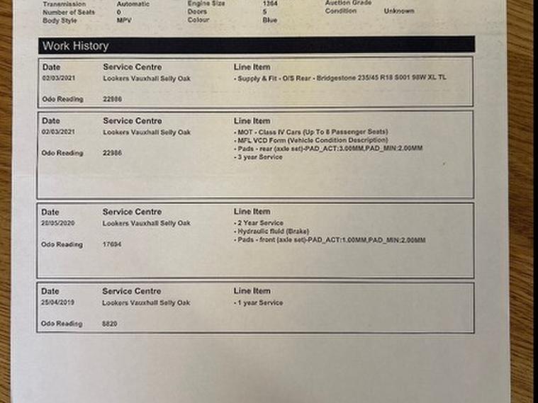 This car comes with 7 seats, Blue, 2 owners, 12-Volt Electrical Accessory Socket within Front and Rear Centre Console, 18in Alloy Wheels - 5 Twinspoke, 35-30-35 Split Folding 2nd Row Seats, ABS - Anti-Lock Braking System, Adaptive Brake Lights, Air Conditioning, Ambient Lighting - LED Facia-Centre Console Downlighter, Anti-Submarining Ramps in Front Seats, Black Door Panels with Black Atlantis Cloth Inserts, Black Facia with Silver Trim Inserts, Black Trim on Door Pillars, Blasted Silver Trim Inserts on Front Doors, Body Colour Door Mirrors, Body-Colour Door Handles, Body-Coloured Rear Roof Spoiler, Bonnet - Headlight - Wiper Structure, Burst-Proof Door Locks and Anti-Jam Door Design, CBC - Cornering Brake Control, Central Facia Display, Central Front Courtesy Light, Central Rear Courtesy Light, Centre Storage Facility with Two Cupholders and Front Centre Armrest, Child Proof Locks on Rear Doors, Chrome Effect Interior Door Handles, Chrome-Effect Front Grille Bar, Cruise Control with Speed Limiter, Dark Style Headlights, Dark Style Tail Lights, Dark Tinted Rear Windows, Deactivation Switch for Front Passengers Airbag, Deformation Zones Front and Rear, Dipping Rear-View Mirror, Door-to-Door Illumination, Drag Torque Control, Driver Information Display, Drivers Airbag, Drivers and Front Passengers Lap Belt Pretensioner System, Drivers and Front Passengers Sunvisors Incorporating Illuminated Vanity Mirrors with Covers, EBD - Electronic Brakeforce Distribution, ESP - Electronic Stability Programme, Electric Headlight Beam Levelling, Electrically Operated Front and Rear Windows with Safety Autoreverse and One-Touch Facility, Electronically Protected Audio Equipment, Ellipsoid Headlights, Emergency Brake Assist, Energy Absorbing Steering Column, Engine Deadlock Immobiliser, Fade Up-Fade Down Courtesy Lights, Fading Brake Support, First and Second Row Reading Lights with Illuminated Switches, Five Lap and Diagonal Inertia-Reel Seatbelts, Four Adjustable Facia Vents, Four Load Restraint Lashing Eyes, Freewheeling Door Locks, Front Body Lock Diagonal Seatbelt Pretensioner System, Front Door Pockets, Front Fog Lights, Front Passenger Airbag, Front Seatbelt Force Limiters, Front and Rear Parking Distance Sensors, Fuel Gauge with Low Fuel Warning Light, Full Size Curtain Airbags for Driver - Front Passenger and Outer Rear Seat Passengers, Fully Carpeted Load Area, Glovebox with Lid, Hazard Warning Lights, Heated Rear Screen with Timed Cut-Off, Heated Rear Window, Height Adjustable Front and Outer Rear Seats Head Restraints, Height-Adjustable Active-safety Front Seat Head Restraints, Height-adjustable and Removable Head Restraints - Second and Third Row Seats, High-Level LED Centre Rear Brake Light, Hill Start Assist, ISOFIX Child Seat Mountings Incorporating Top Tether Anchor Points Located on Outer Rear Seats, Illuminated Glove Box and Luggage Area, Illuminated Load Area, Interior Tailgate Handle, Intermittent Rear Window Wash-Wipe, Key Left in Ignition Audible Warning, LED Daytime Running Lights, Laminated Windscreen, Lights On Audible Warning, Locking Wheel Bolts for Alloy Wheels, Luggage Compartment - Cover, Manually Foldable Door Mirrors, Multi-Function Trip Computer, Navi 950 IntelliLink Touchscreen Navigation and Infotainment System, Pedal Release System, Rake and Reach Adjustable Steering, Rear Door Pockets, Rear Fog Light, Reinforced Passenger Safety Cell, Remote Control Central Locking, Remote Control Ultrasonic Security Alarm System, Rev Counter, Reversing Lights, Rollover Mitigation, Roof Rails - Silver Effect, Seat Comfort Pack One, Second-row Seats with Sliding Function plus Fold-flat Facility, Shift - Up-Down Indication Light, Side Impact Protection Beams, Side Repeat Indicators, Side Window Demist Vents, Silver Air Vent Surrounds, Solar Heat Absorbing Windscreen, Speakers - x6, Speed Sensitive Electrically Assisted Power Steering, Speedometer, Sports Pedals, Sports-Style Front Seats, Steering Wheel - Mounted Audio Controls, Steering Wheel - Three-Spoke Design - Leather Covered with Accent Stitching - Satin Chrome-Effect Bezel, Storage Box On Drivers Side Lower Facia, Storage Pockets on Front Seat Backs, Straight Line Stability Control, TPMS - Tyre Pressure Monitoring System, Third Row Central Storage Facility with Two Cup Holders, Third Row Passenger Compartment Reading Lights, Third-row Lap and Diagonal Inertia-Reel Seatbelts, Tinted Windows, Twin Electrically Adjustable - Heated Door Mirrors, Twin Gas Assisted Tailgate Struts, Two Front Seat Side-Impact Airbags, Two Individual Fold Flat Third-row Seats, Two Speed Windscreen Wipers with Variable Intermittent Wipe, USB Power Socket for Rear Seat Passengers, Upper and Lower Bumper Design, VIN - Visible Vehicle Identification Number, Vauxhall OnStar, Water Temperature Gauge with Warning Light, Windscreen Demist Vents,