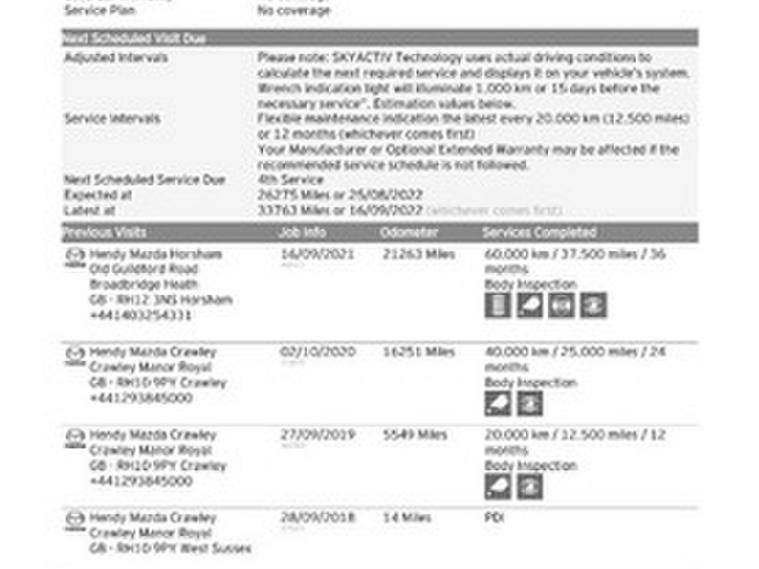 This car comes with 5 seats, Grey, 2 owners, 16in Alloy Wheels - Gunmetal, 7in Colour Touch Screen Display, ABS - Anti Lock Braking System, AM-FM-DAB Radio - Single CD Player-MP3 Audio System with 6 Speakers, AUX and 2 USB Inputs, Air Conditioning - Climate Control, Analogue Speedometer, Brilliant Black Rear Spoiler, Chrome Exhaust Trim, Courtesy Light with Integrated Spotlight, Cruise Control with Adjustable Speed Limiter, Dashboard Panel - Black - Soft-Touch with White Stitching, Door Mirrors - Electrically Adjustable - Heated - Power Folding with Integrated Indicator Lights, Door Pockets - Driver and Front Passenger, Dual Front Airbags, Dusk Sensing Automatic Headlights, Dynamic Stability Control - DSC - with Traction Control System - TCS, Electric Windows - Front and Rear with One Touch Auto Up and Down on Drivers Side, Electronic Power Assisted Steering, Emergency Stop Signalling System - ESS, Engine Start-Stop Button, Front Fog Lights - LED, Front Grille Insert - Dark Grey Metallic, Front Passenger Airbag Cut-Off Switch, Front Passenger Seat - Manual Height Adjustment, Front Passengers Seat - Manual Slide and Recline Adjustment, Front Side Airbags, Front and Rear Curtain Airbags, G-Vectoring, Gear Knob - Leather, Gear Shift Indicator, Glovebox, Grab Handles - Front Passenger and Two Rear with Coat Hooks, Halogen Daytime Running Lights, Handbrake - Leather Wrapped, Headlights - Coming-Leaving Home, Headlights - Halogen with Manual Headlight Levelling, Hill Hold Assist, ISOFIX Child Seat Anchorage - Attached to Outer Rear Seats, Integrated Bluetooth System, Lane Departure Warning System, Luggage Compartment - Light, MZD-Connect, Multimedia Commander, Privacy Glass - Rear and Rear Side Windows, Rain-Sensing Front Wipers, Rear Parking Sensors, SRS - Supplementary Restraint System, Satellite Navigation System, Seatback Pocket - Front Passenger, Seatbelt - Reminder Screen - Driver - Passenger and Rear Seats with Audible Warning, Seatbelts - Front - 3 Point - ELR x 2 with Pre-Tensioners, Seatbelts - Rear - 3-point - ELR x 2 with Pre-tensioners, Seats - 60-40 Split Folding Rear, Seats - Drivers Manual Slide-Recline and Height Adjustment, Self-Supporting Rigid and Torsion-Resistant All-Steel Body with Defined Crush Zones for the Front and Rear Sections - Stable Passenger Safety Cell with Side Impact Reinforcement in the Doors, Shark Fin Antenna, Smart City Brake Support, Smart Keyless Entry, Steering Wheel - Leather, Steering Wheel - Mounted Remote Audio Controls, Steering Wheel - Paddle Shift, Steering Wheel - Telescopic and Tilt Adjust, Sunvisors - Drivers and Front Passengers with Covered Vanity Mirror and Drivers Ticket Holder, Thatcham Category 1 Alarm and Immobiliser, Three Height Adjustable Rear Head Restraints, Trip Computer, Tyre Pressure Monitoring System, Tyre Repair Kit, Wipers - Rear Adjustable Speed with Intermittent, i-Stop Status,