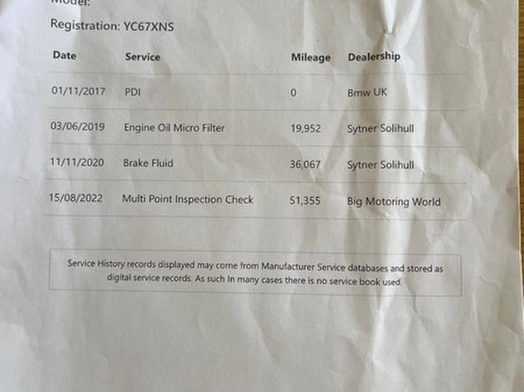 This car comes with 5 seats, Silver, 3 owners, Upgrades - PDC - Park Distance Control - Front and Rear, Enhanced Bluetooth Telephone Preparation with USB Audio Interface and Voice Control, Seat Heating for Driver and Front Passenger, Sun Protection Glazing, Dakota Leather - Black with Black Interior, Standard Features - 12V Power Socket - Centre Console, 12V Power Socket - Passenger Footwell, 16in Alloy Wheels - Light Star Spoke - 654, Active Differential Brake - ADB Sport - Electronic Differential Lock in DSC-Off Mode, Air Conditioning - Automatic - Single Zone, Airbags, Alarm System - Thatcham 1 with Remote Control and Engine Immobiliser, Armrest - Front with Sliding Adjustment, BMW ConnectedDrive Online Services, BMW ConnectedDrive Services, BMW Emergency Call, BMW Mobility Tyre Sealing System, BMW Navigation System, BMW Professional Radio - Single CD and MP3, BMW TeleServices, Battery Age Recognition Function, Battery Safety Cut Off, Bluetooth Hands Free with USB Audio Interface, Brake Pad Wear Indicator - Front and Rear, Bumper System Front and Rear - Replaceable Deformation Elements for Impacts Up to 9mph, Central Locking Switch - Doors - Fuel Filler Cap - Luggage Compartment, Check Control Warning System for Monitoring of Lights and Door-Luggage Compartment Open Warning, Child Proof Locking System - Rear Doors, Child Seat ISOFIX Attachment for the Two Outer Rear Seats, Condition Based Service, Crash Sensor - Activating Central Locking Release - Hazard Warning Lights - Battery Safety Cut Off - Interior Lighting, Cupholders Two with Sliding Cover and Inlay Mat, DAB Digital Radio, DSC - Dynamic Stability Control Plus, Daytime Driving Lights, Direction Indicator - Side Repeaters - Integrated in Exterior Mirrors, Direction Indicator Lights - Clear Lenses, Door Sill Finishers - BMW Designation - Front - Black, Drive Performance Control with ECO PRO - Comfort and Sport Modes, Dynamic Brake Lights, ECO PRO Mode, Electric Windows - Front and Rear with Open-Close Fingertip Control - Anti-Trap Facility and Comfort Closing Function, Exhaust Tailpipe - Single Round Left Chrome Finisher, Extended Storage, Exterior Mirrors Electrically Adjustable, Exterior Parts in Body Colour, First Aid Kit and Warning Triangle, Floor Mats - Velour, Front Fog Lights, Glove Compartment, Glovebox - Handle with Chrome Surround, Grab Handles - Integrated in Roof Linings - Four, Halogen Headlights, Handbrake and Gear Knob - Leather, Head Restraints - Rear and Folding, Heat Protection Glazing with Green Tint, High Level Third Brake Light, Incorrect Fuelling Protection System, Instrument Cluster, Interior Lighting - Front Centre Over Interior Mirror and Rear Centre, Interior Trim - Satin Silver, Kidney Grille - Chrome with Black Vertical Slats, Lashing Eyes in Luggage Compartment at Sill x2, Lights-On Warning by Audio Warning Signal When Ignition is Switched Off, Locking Wheel Bolts, Luggage Compartment - Light, Luggage Compartment Access via BMW Roundel, Model Designation, Multifunction Controls for Steering Wheel, Non Smokers Package, OBC - On-Board Computer, Oil Temperature Display via On-Board Computer Shown in Central Screen in Instrument Cluster, Optimum Shift Indicator, Personal Profile, Power Steering - Electric, Rain Sensor with Automatic Headlight Activation, Real Time Traffic Information, Rear Fog Light - Offside, Rear Seat Headrests - Outer Headrests Folding, Rear Window Aerial, Remote Control Including Integrated Key - 2, Reversing Light in Rear Cluster - Nearside, Seat Belt Security Check for Driver and Front Passenger, Seats - 60-40 Split Folding Rear, Servotronic Steering, Shark Fin, Side Armrests - Front and Rear Integrated into Door Trim, Side Impact Protection, Standard Seat for Driver and Passenger with Manual Adjustment, Start-Stop Button with Comfort Go Keyless Engine Start and Auto Start-Stop Deactivation Button, Steering Wheel - 3-Spoke Leather, Steering-Wheel Column Adjustment - Manual, Storage Compartment - Rear Centre Console and in Door Trim - Front, Sun Visors with Vanity Mirrors and Ticket Holder, TPMS - Tyre Pressure Monitoring System, Three-Point Seat Belts - All Seats, Twin Horns, Tyres - Reduced Rolling Resistance, Visible VIN, Welcome Light, Windscreen Wiper - Rear,