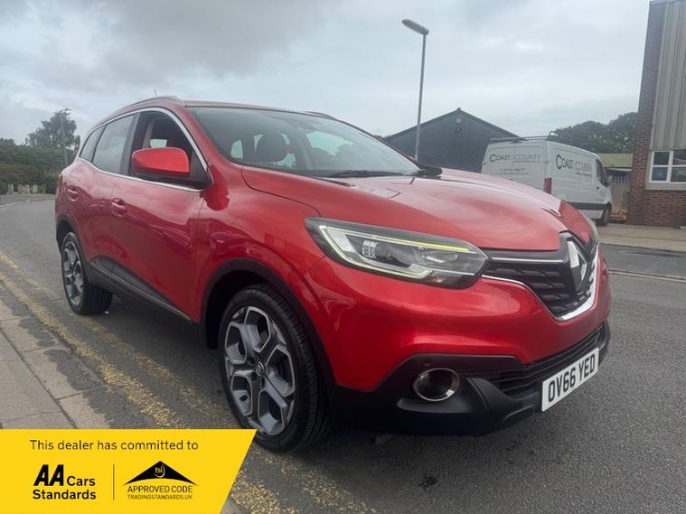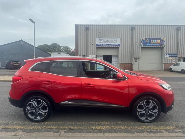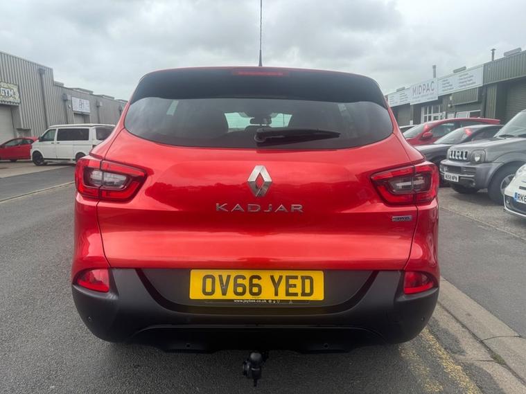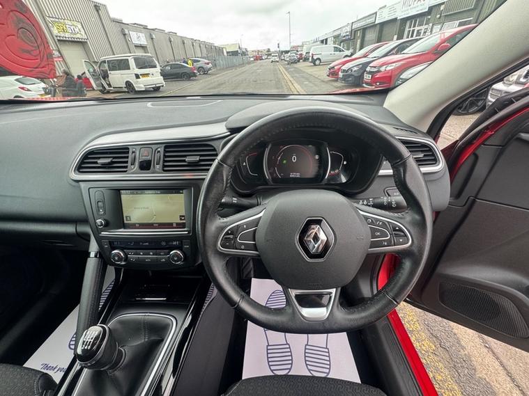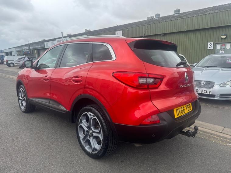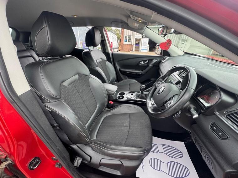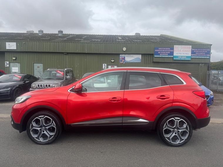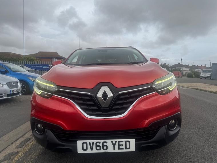 2016 (66) Renault Kadjar 1.6 dCi Dynamique S Nav 5dr in Flame Red. 1 owner example with a full service history (9 stamps) and 2 keys. Runs and Drives brilliantly and is equipped with the reliable 1.6 dCi engine. 4x4 model which the driver can seamlessly switch from 2WD to 4WD making it a practical choice for all seasons. As well as this the Kadjar is a highly efficient vehicle with the 1.6 diesel engine returning over 61 MPG on a run and over 57 MPG combined. Euro 6 diesel making this vehicle ULEZ compliant. Timing chain meaning no costly belt changes required. 12 Months MOT, Service and 6 Months Warranty come with the sale. High spec with Navigation, Half leather, 19 inch alloy wheels, Bluetooth phone + music, DAB Radio, Factory tow bar, Cruise control and more. A well presented 1 owner example of the Renault Kadjar with full service history. Finance Available.