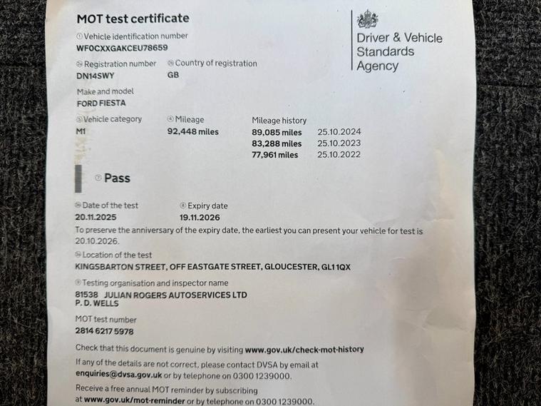 This 2014 Ford Fiesta Zetec presents a superb ownership history, having been cared for by only two owners since new. Powered by an efficient 1.25 litre petrol engine, this popular model also benefits from manual air conditioning, ensuring a comfortable cabin environment whatever the weather., , The Zetec trim level offers a well rounded package, and this particular Fiesta stands out with its low insurance group rating, making it an economical choice for many drivers. These factors combined indicate that this Fiesta offers excellent value and a more affordable ownership experience compared to similar vehicles on the market., 3 months warranty, MOT Until 19/11/2026, Last serviced 19/11/2025 at 92, 435 miles, Part service history, Grey Cloth interior, 5 seats, White, 2 owners, Upgrades - Spare Wheel - 14in Steel, Standard Features - 12V Power Socket - Front, 15in Alloy Wheels - 5x2 Spoke, ABS - Anti-lock Braking System, Aesthetic Lighting Package, Air Conditioning - Manual, Airbags - Curtain, Airbags - Driver Side Knee, Airbags - Front Passenger, Airbags - Head and Thorax, Airbags - Passenger Deactivation, Brake Warning Lights - Automatic Flashing of Brake Lights Under Heavy Braking, Bumpers - Front and Rear - Body Colour, Centre Console - with Trinket Tray - Two Cup Holders, Chrome Belt Line Finisher, Courtesy Light - Overhead with Theatre-Style Dimming, Courtesy Lights with Map Reading Lights, Door Handles - Body Colour, Door Mirrors - Electrically Operated and Heated, Drivers Airbag, EBA - Emergency Brake Assist, EBD - Electronic Brakeforce Distribution, ECOmode, EPAS - Electric Power Assisted Steering, ESP - Electronic Stability Programme, Electric Windows - Front with One Touch Lowering Drivers, Emergency Brake Warning - Automatic Hazard Warning Lights, Ford AM-FM CD Audio System, Ford Easy Fuel Capless Refuelling System with Misfuel Inhibitor, Front Fog Lights - Chrome Bezel Rings, Front Lower Grille Insert and Surround - Black, Front Seatback Map Pockets - Driver and Passenger, Front Upper Grille - Chrome Finish Surround, Front Upper Grille Insert - Chrome bars, Gear Knob - Leather, Gearshift Indicator Light, Gearshift Knob - Leather-Trimmed with Chrome Finish Bezel, Glovebox - Illuminated, Handbrake Release Knob - Chrome, Head Restraints - 2-way Adjustment, Head Restraints - Rear 2-Way Adjustment, Headlights - Courtesy Delay, Headlights - Follow Me Home, Headlights - Halogen Projector with Silver Bezel, Headliner - Woven, Heated Front Windscreen, High-Mounted Rear Brake Light, IPS - Intelligent Protection System, Interior Door Lever - Chrome Finish, LED Ambient Courtesy Lighting, Leather-Trimmed Handbrake, Loadspace Compartment Light, Loadspace Floor Carpet, Locking Wheel Nuts, MyKey, Passenger Airbag Deactivation Indicator, Passengers seat manual 2-way adjustment, Pollen Filter, Rake and Reach Steering Adjustable, Rear Courtesy Lights, Rear Seats Back - Carpet, Rear Spoiler - Body Colour, Remote Central Locking, Removable Package Tray, Seats - 60-40 Split Folding Back and Fixed Cushion, Seats - Drivers 4-Way Adjustment, Seats - Front Comfort Style, Seats - ISOFIX Mounting Brackets for Child Seats, Second Remote Ignition Key, Steering Wheel - 3-Spoke - Leather Trimmed with Bezel, Steering Wheel - Multifunction, Stowage Pockets - Driver and Front Passenger Seatbacks, Suspension - Front Stabiliser Bar, Tailgate Handle - Body Colour with Chrome Finisher, Trip Computer, Tyre Inflator Kit, USB and AUX Connection for External Music Devices, AS WE ARE AN AA CARS DEALER THIS VEHICLE COMES WITH 12 MONTHS AA BREAKDOWN COVER.