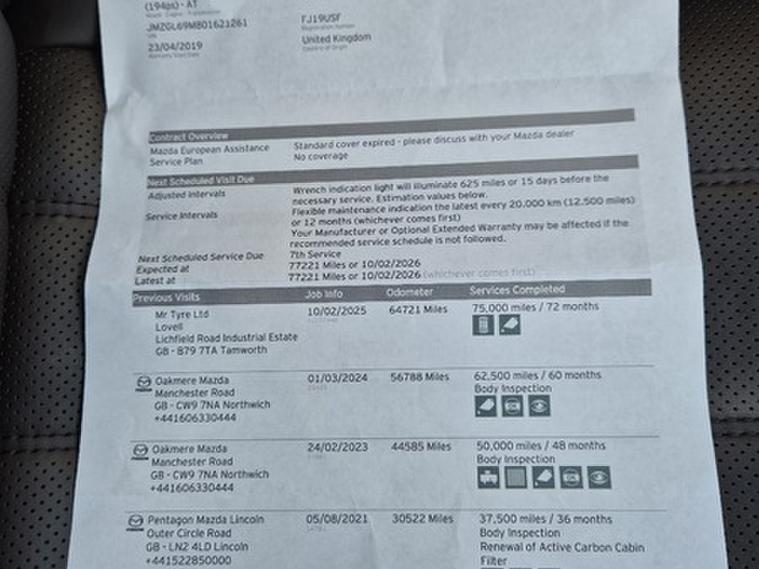 This car comes with 5 seats, Grey, 2 owners, 19in Alloy Wheels - Bright Finish, 2 - Way Power Adjustable Front Passenger Seat, 360 Degree View Monitor, 4-Way Power Adjustable Driver Seat with Memory, 7inch i-ACTIV TFT Display, ABS - Anti Lock Braking System, Active Bonnet, Advanced Smart City Brake Support, Air Conditioning - Dual Zone Climate Control, Black Roof Lining, Blind Spot Monitoring with Rear Cross Traffic Alert, Bumper - Front Body Coloured with Bright Lower Mouldings, Bumper - Rear Body Coloured with Gloss Black Lower Moulding, Chrome Bezel and Different Stitching to Steering Wheel, Colour Active Driving Display - Colour Head-Up Display, Colour Co-ordinated Interior with Chrome and Real Wood Accents, Colour TFT Display with Traffic Sign Recognition, DSC - Dynamic Stability Control, Door Mirrors - Electrically Adjustable - Heated - Auto Power Folding with Integrated Indicator Lights, Door Pockets - Driver and Front Passenger, Driver Memory Seat with Active Driving Display, Dual Chrome Exhaust Tailpipe, Dual Front Airbags, Dusk Sensing Automatic Headlights, EBD - Electronic Brakeforce Distribution, Electric Windows - Front and Rear with One Touch Auto Up and Down on Drivers Side, Electrical Power Outlet, Electronic Parking Brake with Auto Hold Function, Electronic Parking Brake with Auto-Disengage Function, Emergency Stop Signalling System - ESS, Emergency Tyre Repair Kit, Engine Start-Stop Button, Frameless Auto Dimming Rear View Mirror, Front Fog Lights - LED, Front Passenger Airbag Cut-Off Switch, Front Side Airbags, Front Wiper De-Icer, Front and Rear Courtesy Lamps, Front and Rear Curtain Airbags, Garnish Moulding - Bright, Gear Shift - Leather-Wrapped, Glovebox Illumination, Grab Handles - Front Passenger and Two Rear with Coat Hooks, Grille - Gunmetal Finish, Headlights - Adaptive Front Lighting System, Headlights - Coming-Leaving Home, Headlights - LED with Auto Headlight Levelling, Heated Front Seats with 3-Stage Settings, Heated Outer Rear Seats with 3-Stage Setting, Heated Steering Wheel, High Beam Control, Hill Hold Assist, ISOFIX Child Seat Anchorage for Outer Rear Seats, Instrument Panel and Door Trim - Ultrasuede and Real Sen Wood Inlay, Integrated Bluetooth, Intelligent Speed Assist, Interior Courtesy Light with Integrated Spotlight, Karakuri Tonneau Cover, LED Daytime Running Lights, LED Illumination, Lane Keep Assist System, Luggage Compartment - Light, Luggage Compartment - Power Outlet, Mazda Navigation System - European Mapping with Alternative Route Calculations - Point of Interest Search and 3-Years Free Map Updates, Mazda Radar Cruise Control, Multimedia Commander, Multimedia System, Overhead Console with Sunglassess Holder, Parking Sensors - Front and Rear, Power Steering, Premium BOSE Surround Sound System, Privacy Glass - Rear and Rear Side Windows, Rain-Sensing Front Wipers, Rear Centre Armrest with Two Cupholders and USB, Rear Seats - 60-40 Fold Down Seats, Rear Seats - Three Height-adjustable Head Restraints, Remote Central Locking with Deadlocking and Automatic Door Lock when Driving, Roof Rails, Safety Pack, Seat Ventilation- Driver and Front Passenger, Seatback Pocket - Front Passenger, Seatbelt Reminder Audible Warning - Driver-Passenger and Rear Seat, Seatbelts - Front - 3 Point - ELR x 2 with Pre-Tensioners, Seatbelts - Rear - 3-Point - ELR, Seats - Drivers Power Lumbar Adjustment, Seats - Drivers Power Slide-Recline and Height Adjustment, Seats - Passengers Power Slide-Recline and Height Adjustment, Shark Fin Antenna, Smart Keyless Entry, Spoiler - Rear Roof Body Coloured, Steering Wheel - Leather Wrapped, Steering Wheel - Paddle Shift, Steering Wheel - Tilt and Height Adjustment, Storage Spaces - Two Cup Holders in Centre Console, Sun Visors - Drivers and Front Passengers, Sunroof - Power Tilt and Slide, TCS - Traction Control System, Tail Lights - LED Rear Combination Lights with LED Rear Turn Lights, Thatcham Accredited Alarm and Immobiliser, Trip Computer, Wipers - Rear Adjustable Speed with Intermittent,