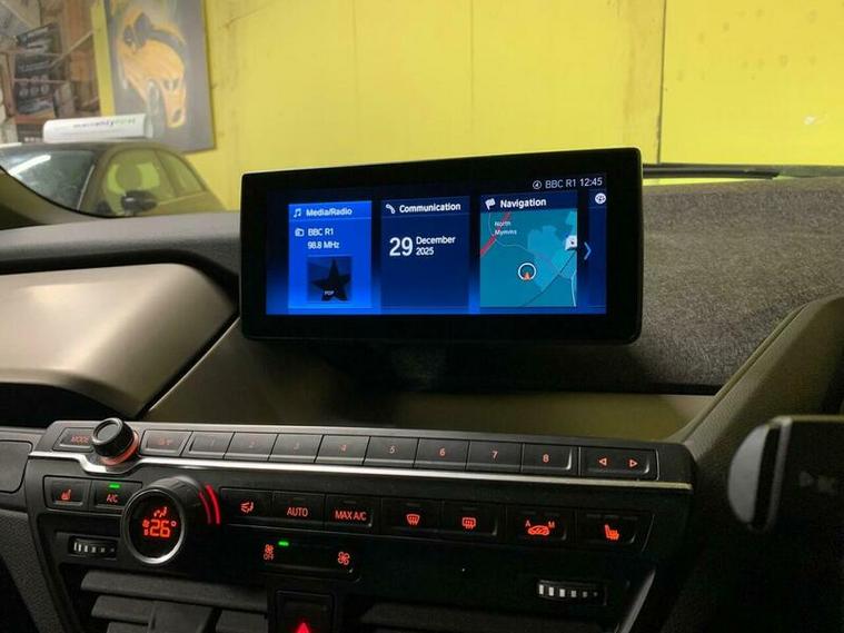 The i3 comes with a host of features including electric windows, electric mirrors, air conditioning, cruise control, rear parking sensors, DAB stereo, built in bluetooth, AUX port, USB port, Sat Nav, auto lights, auto wipers, 20' alloys and multi function steering wheel.