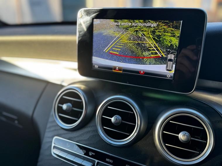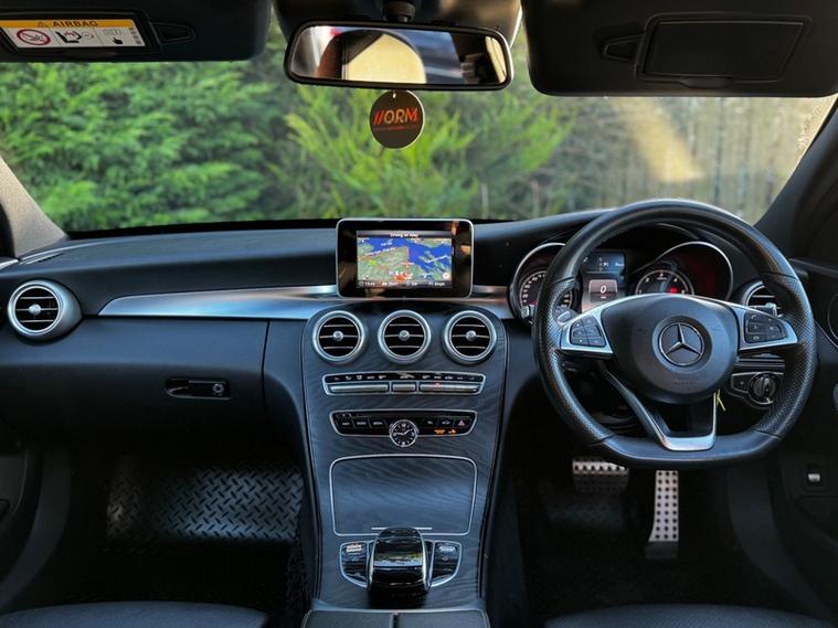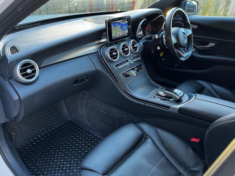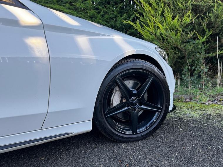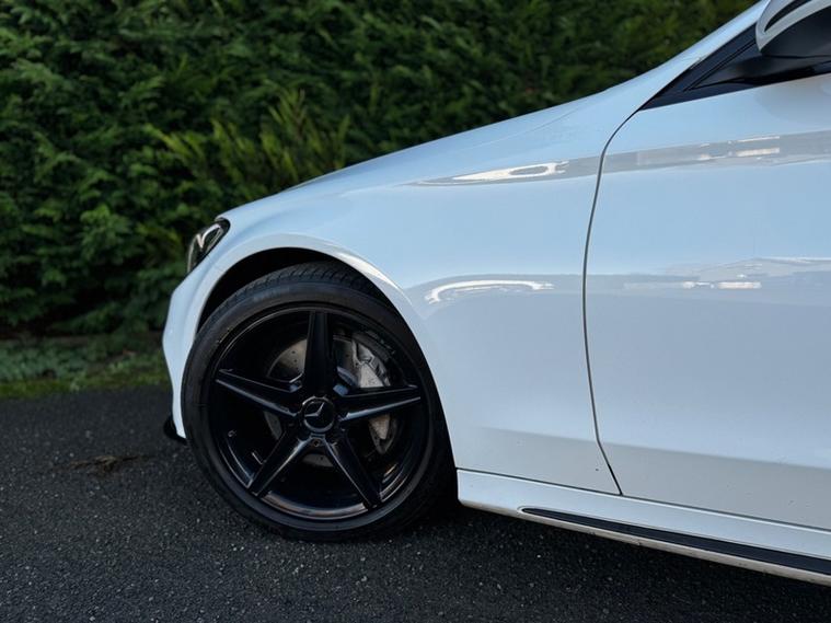 Spec list includes: automatic rain sensing wipers, auto headlights, x neon headlights, 18inch Amg wheels, fully heated leather front seats, electric front seats with electric bolster control, electric tailgate, cruise control, sun protection glazing, navigation, dual zone climate control, dab radio, air conditioning, electric folding mirrors, front and rear parking sensors and reverse camera, black pack, AMG GT grill, C63 style front splitter