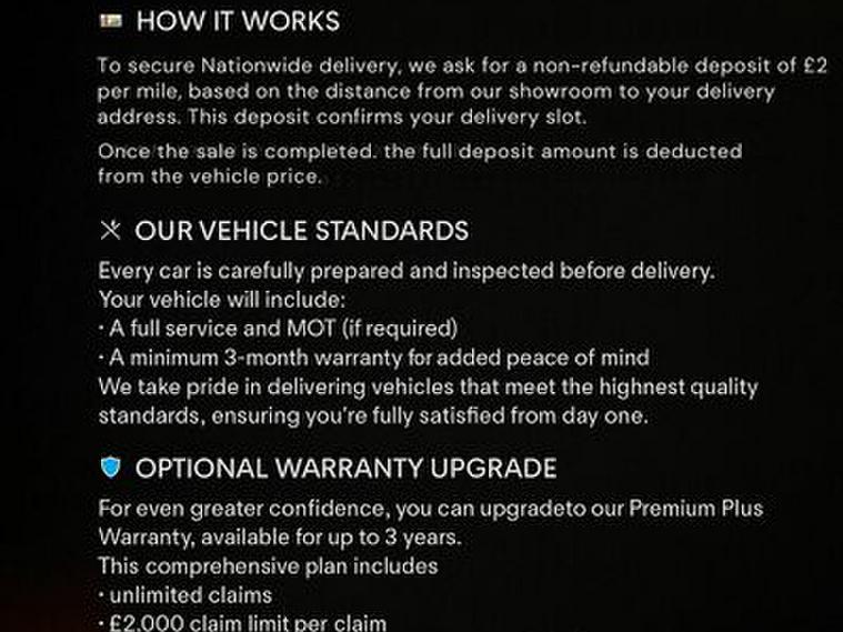 ???? Celebrating 9 Years of Success ? 9th Anniversary Bumper Offer! ????, , We?re proud to celebrate 9 successful years in business, and as a thank you to our valued customers, we?re bringing you this special anniversary offer:, , ? 3 Months Warranty included with every car, covered by Green Cover , , , ? Unlimited claims, Unlimited Courtesy cars covered by Green Cover and always, option to upgrade., , ? Option to upgrade your warranty (Premier Cover) for up to 3 years, , ? Fresh service carried out (if required), , ? Fresh MOT provided if less than 6 months remain, , ? 5 Days Drive Away Insurance with AA ? only £49.99, , ?Free 1 Year AA Basic Breakdown Cover included, , ?Great news! Nationwide delivery is now available ? bringing your next car right toyourdoorstep., (T&Cs apply?contact us or view our Terms&Conditions detail.), , We are a trusted used car dealership in East London with 9 years of proven success. With many years of experience in the motor trade, we are proud to be your **specialist choice for quality second-hand cars and vans., , All our vehicles are HPI checked with Experian, and we provide a **FREE HPI report ? so there are no hidden surprises., , ### ? Our Registrations & Trust Marks, , - Financial Conduct Authority (FCA) Registered ? 951476, , - Companies House dealer's website Registered ? 10225602, , - VAT Registered Firm ? GB269742360, , - ICO Registered under UK GDPR ? ZB131613, , ???? Buy With Confidence, , , - Warranty packages available: 3M, 6M, 12M, 24M, 36M, , - All cars come with minimum 6 months MOT (Fresh MOT if less than 6 months left at the time of sale), , - Service & MOT plans available ? call for a quote, , - All types of cards accepted ????, , - Finance available ? flexible & competitive deals, , - Free Car Finder Service, , - Free Part Exchange Valuation ? PX welcome, , - Family-run business with excellent track record, , - New stock arriving daily ? vehicles bought & sold, , ???? Call us today: 02030182578 ???? Visit us in Romford and drive away with peace of mind & unbeatablevalue!,
