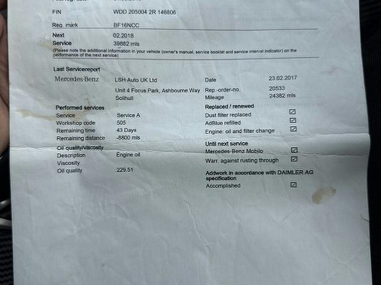 This car comes with 5 seats, White, 4 owners, 17in Alloy Wheels - 5 Twin-Spoke Design, 7in Colour Display - High-Resolution, ABS - Anti-Lock Braking System, ASR - Acceleration Skid Control, ATTENTION Assist, Active Bonnet - Pedestrian Safety which Detects an Impact and Raises Bonnet, Active Park Assist with Parktronic, Adaptive Brake Lamps, Adaptive Brake System with Hold Function and Brake Drying Function, Agility Control Comfort Suspension - Lowered by 15mm, Airbags - Drivers Kneebag, Airbags - Dual Stage - Front Passenger, Airbags - Dual Stage - Side in Front Seats, Airbags - Dual-Stage - Driver, Airbags - Pelvisbag, Alarm System with Immobiliser and Interior Protection, Ambient Lighting - Choice of Three Colour Settings, Ambient Lighting - Cupholders - Door Handle Recess and Overhead Panel in LED, Ambient Lighting - Door Trim and Side of Centre Console in LED, Ambient Lighting - Footwells in LED, Ambient Lighting - Front Door Sills in LED, Audio 20 Radio-CD, Automatic Child Seat Recognition Sensor, Automatic Climate Control - Two-Zone, Automatic Powered Boot Closing, Automatically Dimming Rear View Mirror, Bluetooth Interface for Hands-Free Telephone, Central Locking with Interior Switch, Centre Armrest - Front with Storage, Childproof Locks - Manually Operated for Rear Doors and Electrically Operated for Rear Power Windows, Chrome Trim on Top Half of Door Handles, Collision Prevention Assist Plus, Courtesy Lights in Doors, Crash Sensor with Emergency Opening Function for Doors, Cruise Control with SPEEDTRONIC Variable Speed Limiter, Cup Holder in Centre Console x2, DAB Digital Radio Tuner, Dashboard Trim - Black, Daytime Running Lights - LED, Door Mirrors - Drivers Automatically Dimming, Door Mirrors - Electrically Adjustable-Folding-Heated, Door Mirrors - Memory Function, Door Sill Panels - Mercedes-Benz Lettering, Dynamic Select with a Choice of Driving Modes - Comfort - ECO - Sport - Sport Plus - Individual, ESP - Electronic Stability Programme, Electric Parking Brake, Electric Windows - 4 - With One-Touch Opening and Closing - including Obstruction Sensors, Electronic Key - Chrome Surround, First Aid Kit, Floor Mats - Black, Folding Box Beneath the Luggage Compartment Floor, Glove Compartment - Illuminated, Headlights - High-Performance LED, Heated Front Seats, Heated Windscreen Washer System, ISOFIX Child Seat Attachment Points with Top Tether in Rear, Immobiliser, Instrument Cluster with Two Tube-Design Round Dials and 5.5in TFT Multi-Function Display, Interior Lighting Package, Keyless Go Comfort Package, Keyless Start, Luggage Net in Cargo Area, Media Interface, Memory Package, Mercedes Me Connect, Mirror Package, Outside Temperature Gauge, Panoramic Glass Sunroof, Parking Sensor - Front, Parking Sensor - Rear, Pollen Filter, Power Steering - Direct-Steering Speed Sensitive, Radiator Grille with Integrated Star - Two Louvres in Matt Iridium Silver with Chrome Trim, Radio Aerial Integrated into Rear Window, Rain Sensing Windscreen Wipers, Rear Lights - LED, Rear Reading Lights - LED, Rear Seat Belts Status Indicator, Remote Boot Release, Remote Central Locking, Reversing Camera, Roof Lining - Crystal Grey, SD Card Slot in Centre Console, Satellite Navigation - Garmin Map Pilot, Seat - Electrically Adjustable Driver, Seat - Electrically Adjustable Front Passenger, Seat Belts - Black, Seat Comfort Package - Driver and Front Passenger Seat, Seats - Cushion Depth Adjustment, Seats - Electro-Pneumatic 4-way Lumbar Support with On-seat Controls, Seats - Front Electrical Height Adjustment, Seats - Front Memory Function, Seats - Rear Split Folding 40-20-40, Seats - Sports, Service Indicator ASSYST, Speakers with FrontBass, Speed-Dependent Automatic Locking, Steering Column - Electrically Adjustable, Steering Column with Memory, Steering Wheel - 3-Spoke - Nappa Leather - Silver Chrome - Perforated Leather - Grip Area, Steering Wheel - Gear Shift Paddles, Steering Wheel - Multi-Function, Stowage Package, Sun Visors with Illuminated Vanity Mirrors, TIREFIT with Tyre Inflation Compressor, Tinted Glass All Round - Green, Top Surround of Side Windows in Polished Aluminium, Touchpad, Trim - High-Gloss Black with Aluminium Door Trims, Trip Computer, Tyre Pressure Monitoring System, USB Ports in Centre Console x2, Warning Triangle, Windowbags for Driver-Front Passenger and Rear Passengers, eCall - Emergency Call System,