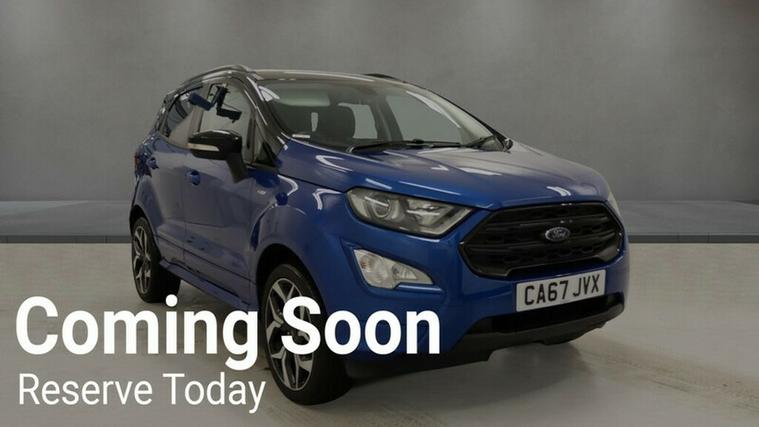 THIS GREAT FORD ECOSPORT ST-LINE COMES WITH WARRANTED MILES AND SERVICE HISTORY WITH 6 SERVICE STAMPS, THE SPEC INCLUDES, THE NEW ECOSPORT SHAPE. A LARGE TOUCHSCREEN INTERFACE WHICH FEATURES SAT NAV, APPLE AND ANDROID CAR PLAY, CRUISE CONTROL AND A LIMITER, AIR CON, DAB RADIO, LEATHER TRIM, 18' ALLOYS, ELETRIC WINDOWS FRONT AND REAR, CLIMATE CONTROL, ROOF BARS , SPORTS PEDALS, THIS CAR WILL COME WITH A BRAND NEW MOT ON PURCAHSE WITH NO ADVISORIES, 12 MONTHS AA BREAKDOWN COVER AND A 3 MONTH WARRANTY. NO ADMIN FEES, AND SUPPLIED WITH A SPARE KEY