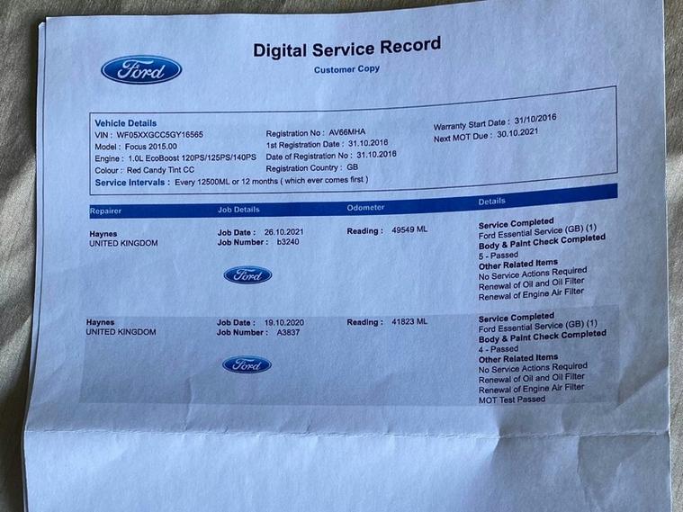 This car comes with 5 seats, Red, 3 owners, 12V Power Socket - Front, 16in Alloy Wheels - 10 Spoke, 8in Touchscreen Colour Display, ABS - Anti-lock Braking System, AUX Connection, Active City Stop, Air Conditioning - Dual Zone Electronic Automatic Temperature Control, Airbag - Front Passenger, Airbags - Curtain, Airbags - Curtain Rear, Airbags - Side Impact, Anti-Submarining Seat Bases, Armrest - Folding Centre - Rear, Automatic Dimming Rear View Mirror, Automatic Rain Sensing Wipers, Black Headlight Bezel, Bluetooth Handsfree Phone System, Body Colour Bumpers, Body Colour Exterior Mirrors, Centre Console - additional 12V power socket, Chrome Finish on Upper Door Line, Colour TFT Instrument Cluster Display, Cruise Control with Adjustable Speed Limiter, Door Handles - Body Colour, Door Mirrors - Electrically Operated and Heated, Door Mirrors with Integrated Indicators, Drivers Airbag, EBA - Emergency Brake Assist, EBD - Electronic Brakeforce Distribution, ESP - Electronic Stability Programme, Electric Windows - Front and Rear with One Touch, Electric Windows - Global Opening-Closing, Emergency Assistance, Emergency Brake Warning, Floor Mats - Carpet - Front, Ford AM-FM CD Audio System, Ford DAB Audio System, Ford Easy-Fuel Capless Refuelling System, Ford Eco Mode - Driver Information System, Ford SYNC2, Front Fog Lights, Front Grille - Chrome, Front Seat Belts with Pre-Tensioners, Fuel Computer, Handbrake Cover - Leather, Headlights - Automatic, Headlights - Halogen, Heated Front Windscreen, Heated Washer Jets, Height-Adjustable Mounts on Front Seat Belts, Hill Start Assist, IPS - Intelligent Protection System, ISOFIX - Child Seat Attachments, Interior Door Lever - Chrome Finish, Keyless Start, Locking Wheel Nuts, Mini Steel Spare Wheel, MyKey, Parking Sensor - Rear, Pedals - Collapsible, Pollen Filter, Power Steering, Premium Centre Console, Premium Centre Console - Sliding Armrest, Rear Auxiliary Power Socket - 12V, Rear Seat - Folding Centre Armrest with 2 Integrated Cup Holders and Flip up Storage, Rear Spoiler - Body Colour, Remote Central Locking, SD Card Reader, Scuff Plates - Front - Aluminium Finish with Ford Logo, Seats - 60-40 Rear Split Back, Seats - Drivers Height Adjustment, Seats - Drivers Lumbar Support, Seats - Front Sports, Speakers - x6, Steering Column - Collapsible, Steering Column - Rake and Reach Adjustment, Steering Wheel - 3 Spoke - Leather Trimmed, Steering Wheel - Audio Controls, TVC - Torque Vectoring Control, Thatcham Category 1 Alarm, Traction Control - TC, Tyre Pressure Monitoring System, USB Connection, Voice Control - Audio,