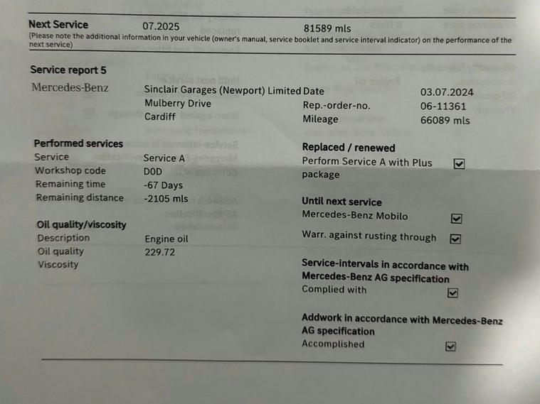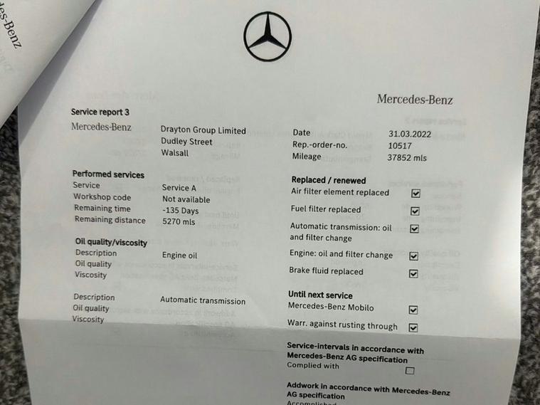 This car comes with 5 seats, Black, 2 owners, 17in Alloy Wheels - 10-Spoke - Painted in Vanadium Silver, ABS - Anti-Lock Braking System with BAS - Brake Assist, ATTENTION Assist, Active Bonnet - Pedestrian Safety Measure which Detects an Impact and Raises Bonnet by 65mm, Active Brake ASSIST, Active Lane Keeping Assist, Adaptive Brake Assist with Hold Function and Hill Start Assist, Adaptive Brake Lights, Air Conditioning - THERMOTRONIC Luxury Automatic Climate Control - Two-Zone with Display, Air Vents with Surround and Cruciform Nozzle in Silver Chrome, Airbag - Kneebag for Driver, Airbags - Dual Stage - Driver and Front Passenger, Airbags - Head and Sidebags - Driver and Front Passenger, Airbags - Windowbags for Driver and Front Passenger, Alarm System with Immobiliser and Interior Protection - Thatcham Category 1, Automatic Child Seat Recognition Sensor, Beltline Strips - Chrome, Bodystyling - Side Skirts - Body-Coloured, Brake-Pad Wear Warning Indicator, Bumpers - Body Coloured, Centre Armrest - Front with Stowage, Childproof Locks - Manually Operated for Rear Doors and Electrically Operated for Rear Power Windows, Chrome Weather Strip, Colour Inserts in Air Vents, Controller on Centre Console with Chrome Surround, Crash-Responsive Emergency Lighting, Cruise Control with Limiter, Cup Holder - Double - Front, DAB Digital Radio Tuner, Direct Steer Speed-Sensitive Power Steering, Direction Indicators with Lane-Changer Function, Door Handles - Body Coloured, Door Mirrors - Electrically Adjustable and Heated with Integrated LED Indicators, Dual Bluetooth Interface - 2 USB Ports - Type C, Dynamic Select with a Choice of Driving Modes - ECO-Comfort-Sport and Individual, ESP - Electronic Stability Programme with ASR - Acceleration Skid Control, ESP Curve Dynamic Assist, Electric Parking Brake, Electric Windows - 4, Executive Package, Exhaust System - Twin Trapezoidal Tailpipes in Polished Stainless Steel, First Aid Kit and Warning Triangle, Floor Mats, Footwell Lights in Front, Front Door Sills with Mercedes-Benz Lettering, Glass - Rear Windscreen - Heated with Timer Control, Glove Compartment - Illuminated, Hard-Disk Navigation, Headlamp Assist - Automatic Headlamp Activation, Hey Mercedes - Voice Activation, High Level Third Brake Light - LED, ISOFIX and Top-Tether Child Seat Fixing Points in Rear - Two Outer Seats, Instrument Cluster - Fluid Level Warning Indicator for Fuel - Oil - Coolant and Washer Fluid, Instrument Cluster - Outside Temperature Display, Instrument Cluster - Service Indicator ASSYST, Instrument Cluster - Trip Computer in Multi-Function Display with Current Fuel Consumption Indicator, Instrument Display - 7in Display, Interior Lighting - Cup Holder - Stowage Compartment Lighting, Interior Lighting - Handle Recess - Closing Handle - Front-Rear-Left-Right, Interior Lighting - Oddments Tray, Interior Lighting - Reading Lamp in Rear in Support Plate - Rear-Left-Right, Interior Lighting - Reading Lamps - Front-Left-Right - Console Downlighter, Interior Lighting - Signal Exit Lamp - Front-Left-Right, Interior Lighting - Signal and Ambient Lamp, Interior Lighting - Touchpad, Interior Lighting - Vanity Lights - Front-Left-Right, KEYLESS-GO Starting Function, LED High Performance Headlamps with Integrated LED Daytime Running Lights, LED Tail Lights, Light Failure Indicator, Live Traffic Information, Luggage Compartment Cover, Luggage Nets on Driver and Front Passengers Backrests, MBUX Multimedia System, Mercedes Me Connect - Standard Services, Radiator Grille - Diamond in Black with One Silver Painted Louvre and Chrome Insert, Radio Aerial Roof Spoiler, Rain-Sensing Windscreen Wipers with Two Sensitivity Settings, Rear Fog Light, Rear Windscreen Wiper, Remote Central Locking and Crash Sensor with Emergency Opening Function, Reversing Camera with Parking Guidelines - 180 Degree View, Roof Lining - Black, Seat Belts - Rear Three-Point - 3, Seat Belts Reminder - Front and Rear, Seat Comfort Package, Seat Occupancy Sensor - Front Passenger Seat, Seats - Front Cushion Length Adjustment, Seats - Front Manually Adjustable, Seats - Rear Seat Backrests - Split Folding 1-3 - 2-3, Seats with Adjustable Head Restraints, Speed Limit Assist, Sports Suspension - Lowered, Steering Column - Manually Adjustable for Height and Reach, Steering Wheel - 3-Spoke Multi-Function - Trimmed in Leather, TIREFIT Tyre-Sealant Kit, Touchpad on Centre Console, Trim - Dark Carbon-Fibre, Tyre Pressure Monitoring System,